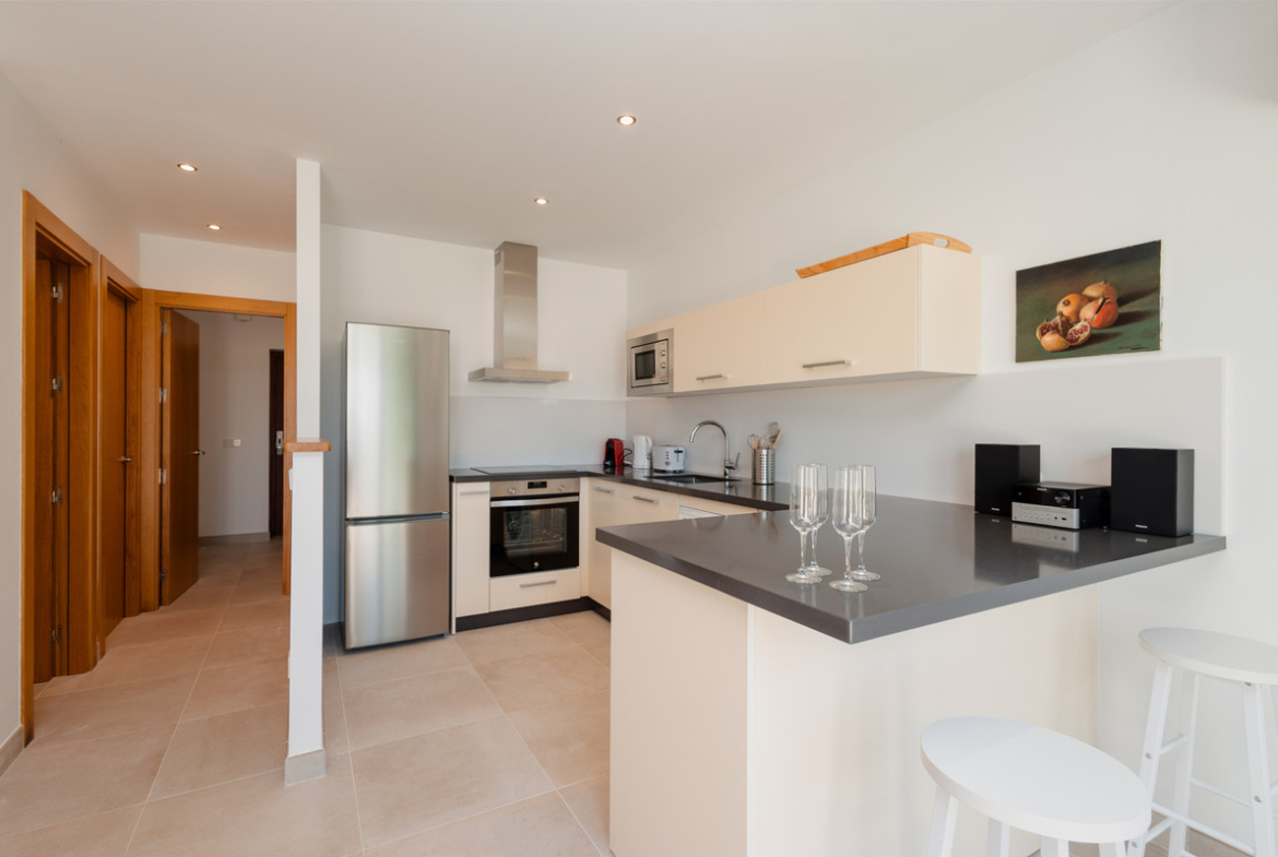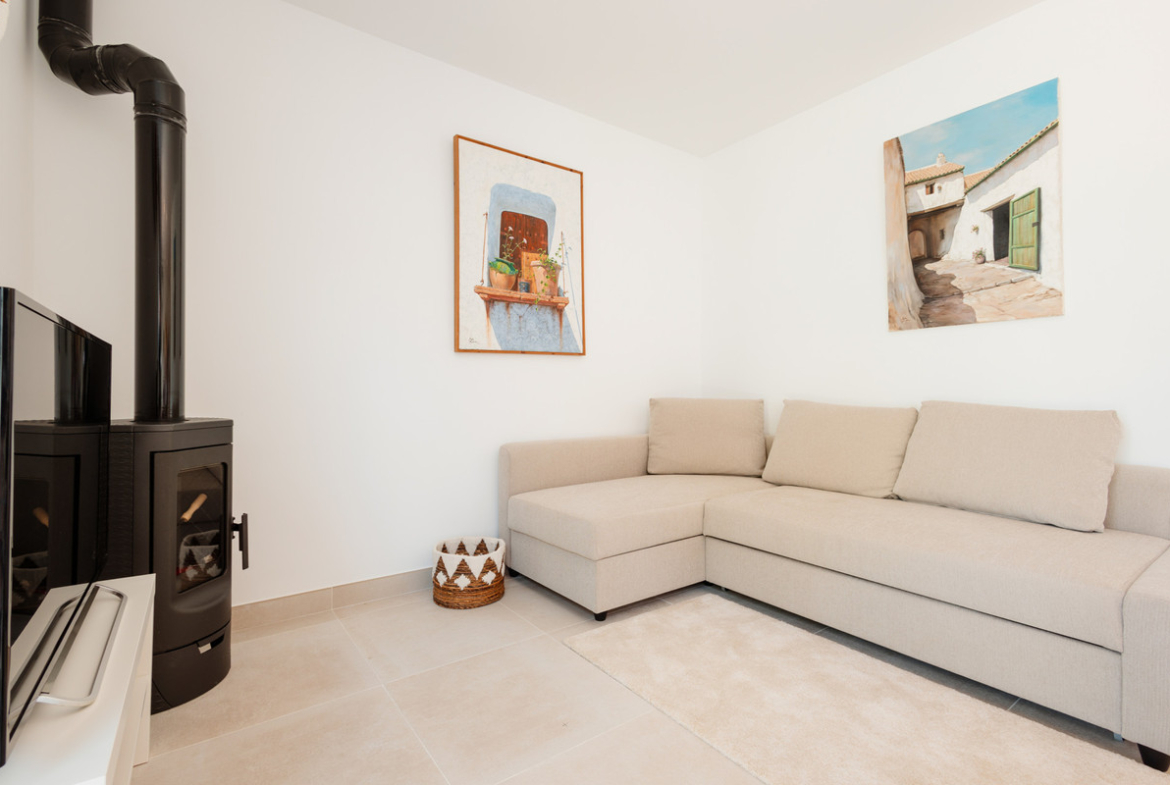 The American-style kitchen is fully equipped with modern appliances such as an oven, microwave, refrigerator, coffee maker, toaster, and kettle. You’ll also find all the necessary utensils to prepare delicious meals. From the living-dining area, you can access a covered terrace with a cozy chill-out area, perfect for relaxing and enjoying the outdoors. There is also a second, larger, and sunnier terrace with an outdoor dining table for two.