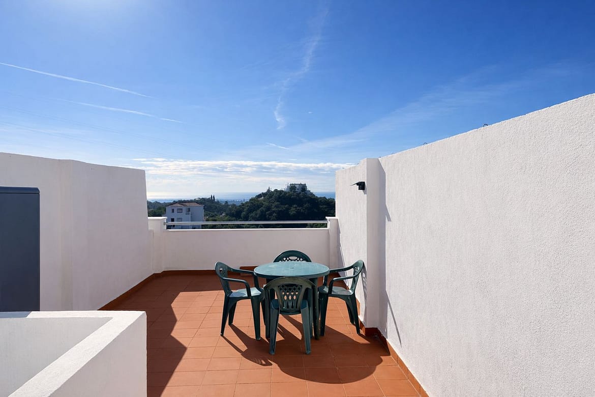 Beautiful duplex apartment in the Las Abejeras – Forest Hills complex, Estepona. Approximately 20 minutes by car to the town center and San Pedro. 6 km from the exclusive Laguna Village shopping center and the beach with its famous beach bars. South-facing with spectacular panoramic views of the sea, Gibraltar, and the African coast. Accommodation: Hall. Fully fitted open-plan kitchen. Living/dining room with direct access to the spacious terrace. On the lower level, there is a double bedroom with an en-suite bathroom with a bathtub. Hot/cold air conditioning.