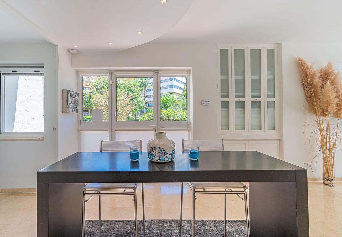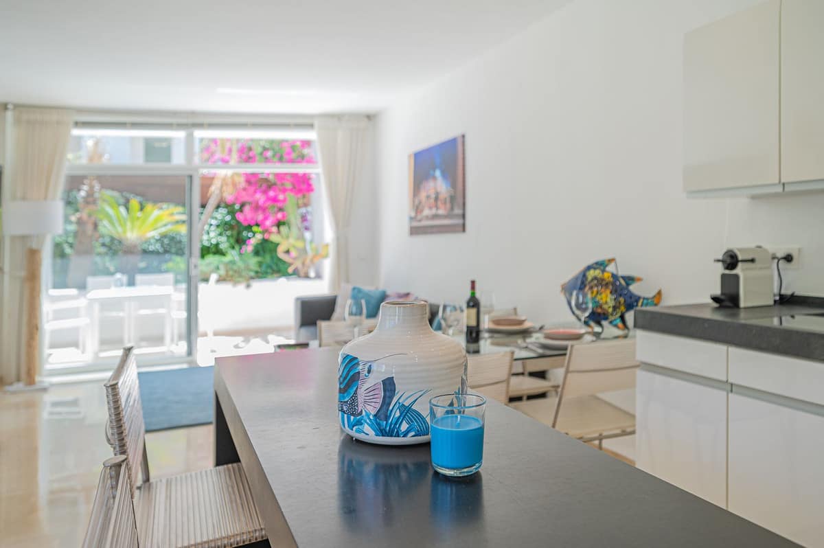 Beautiful one bedroom apartment in Alhambra del Mar on the Golden Mile of Marbella only 100m from the beach promenade and close to all amenities. The apartment consists of a spacious living-dining space with open American kitchen and direct access to a nice terrace with lovely views to the tropical garden of the complex. Furthermore there is a good size bedroom with bathroom and a small dressing area en suite. It is surrounded by the lush gardens and fountains of the Alhambra del Mar urbanization which evoke a permanent feeling of holidays and breathing space. With all amenities at hand and just a few metres from the beach, Capuccino and at walking distance to Marbella centre, the apartment offers an excellent location and a rare opportunity to live by the sea. Includes a good sized storage in the basement.