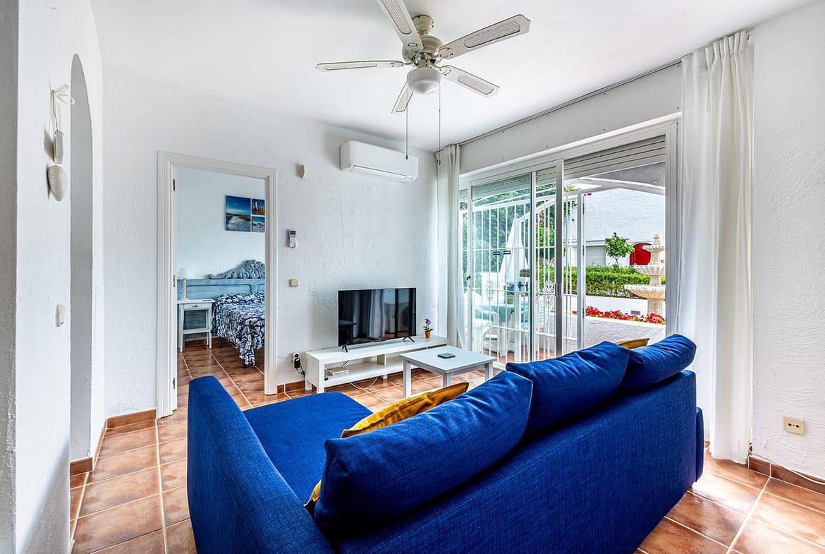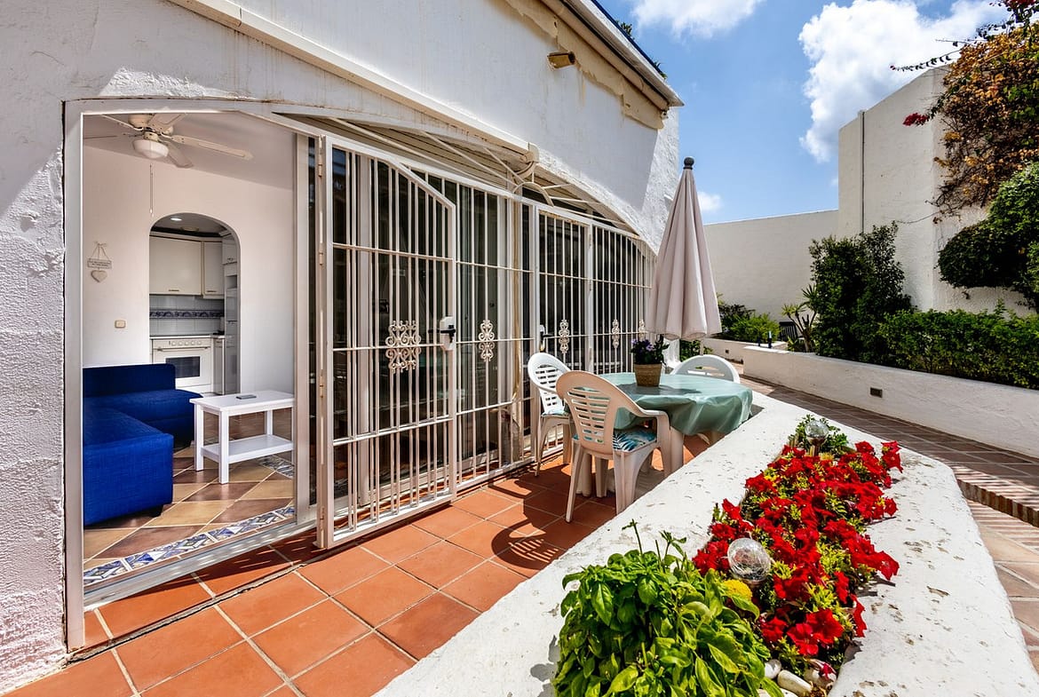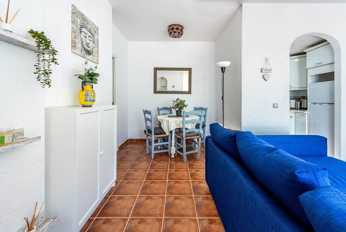 The open-plan living and dining area retains a warm, inviting atmosphere, enhanced by traditional finishes and natural light. The living room leads on to a small terrace, with enough space for a small table and chairs to enjoy the evening breeze.