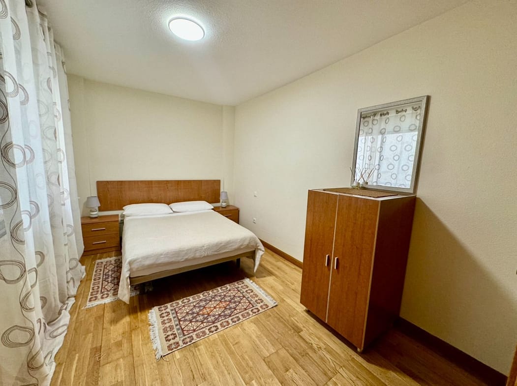 Spacious living area with open plan fully eqquiped kitchen. One bedroom with a bedroom bed, living room with sofa bed for one person.