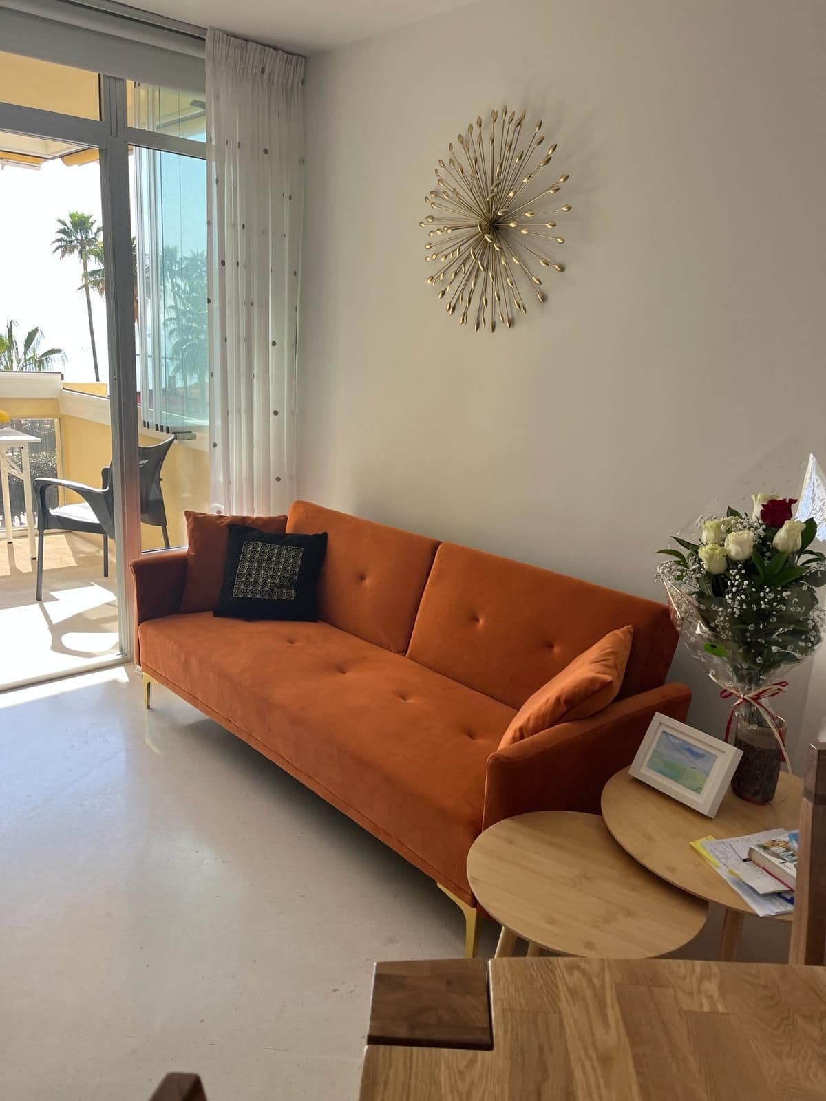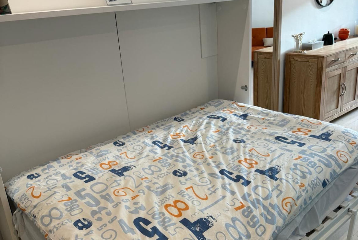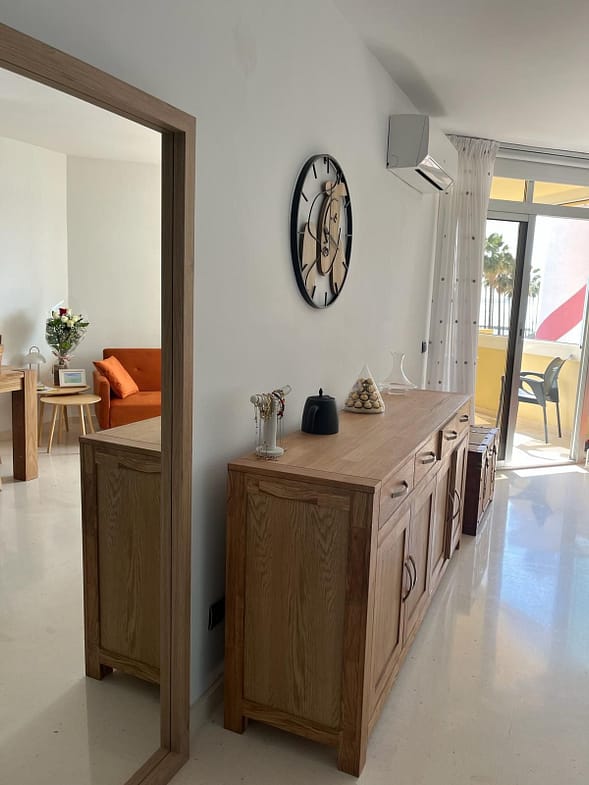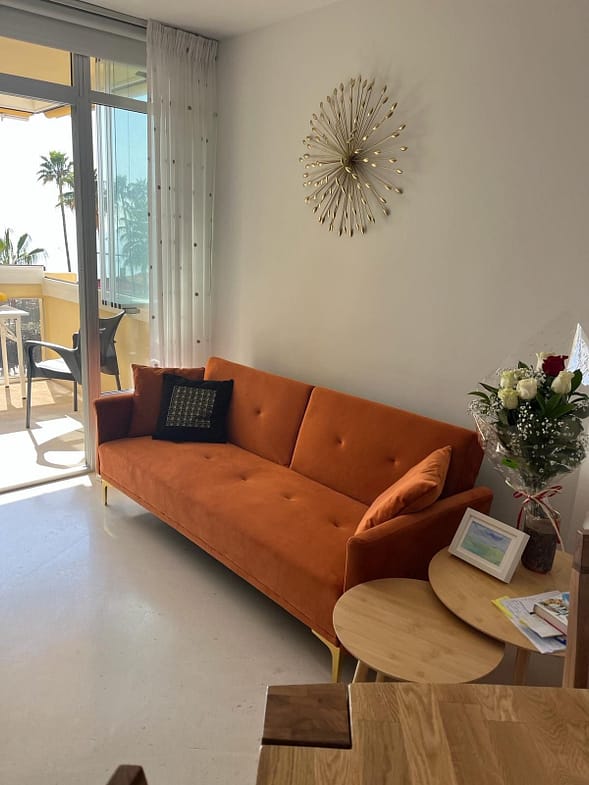 Second floor has big living room with fully equipped kitchen, extra folding bed and sofa bed, own 42” TV, own AC and balcony right to Marbella Promenade Passeo Miritimo.