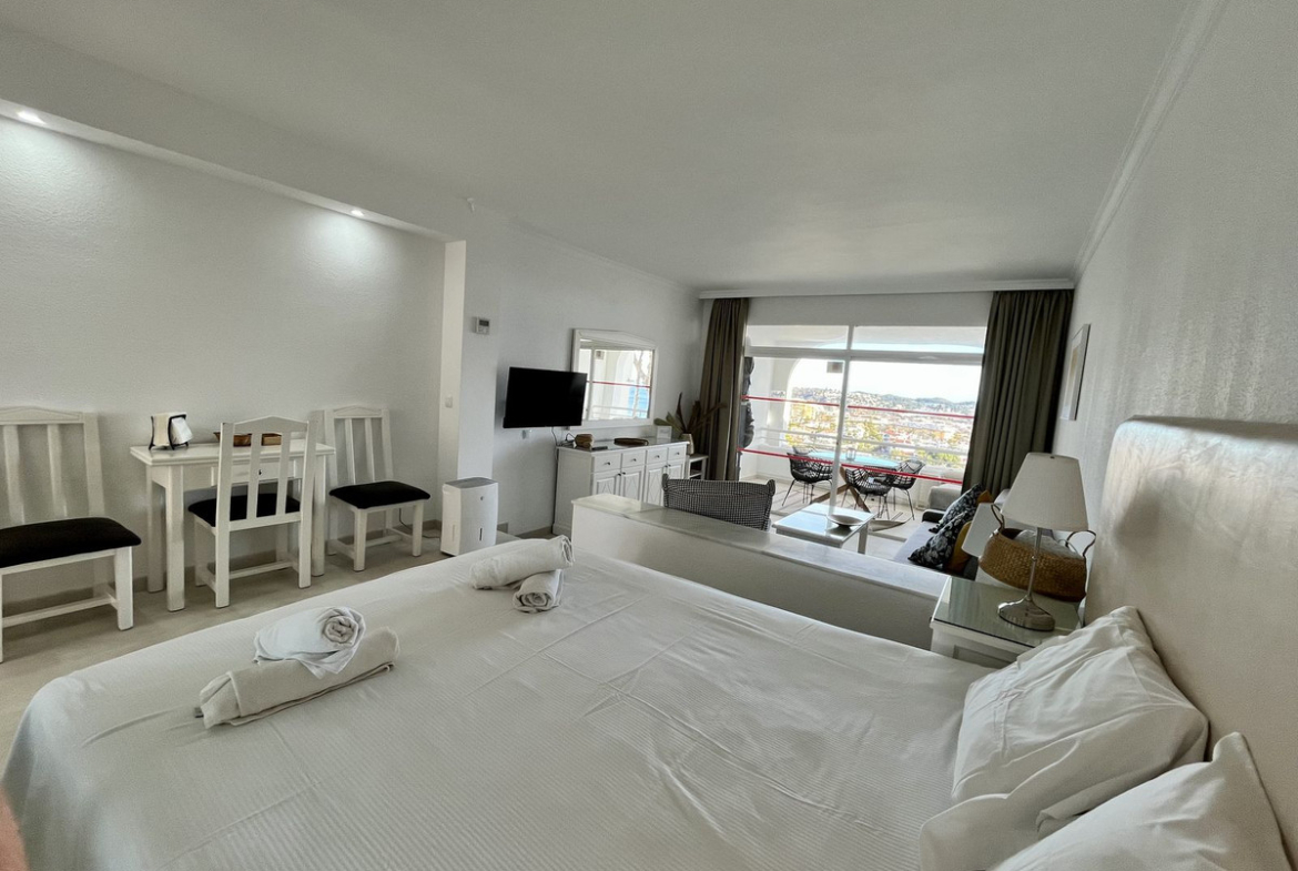 Studio for rent with a beautiful view in Miraflores. The apartment offers a spacious large room connected to the kitchen and terrace, and a separate bathroom.