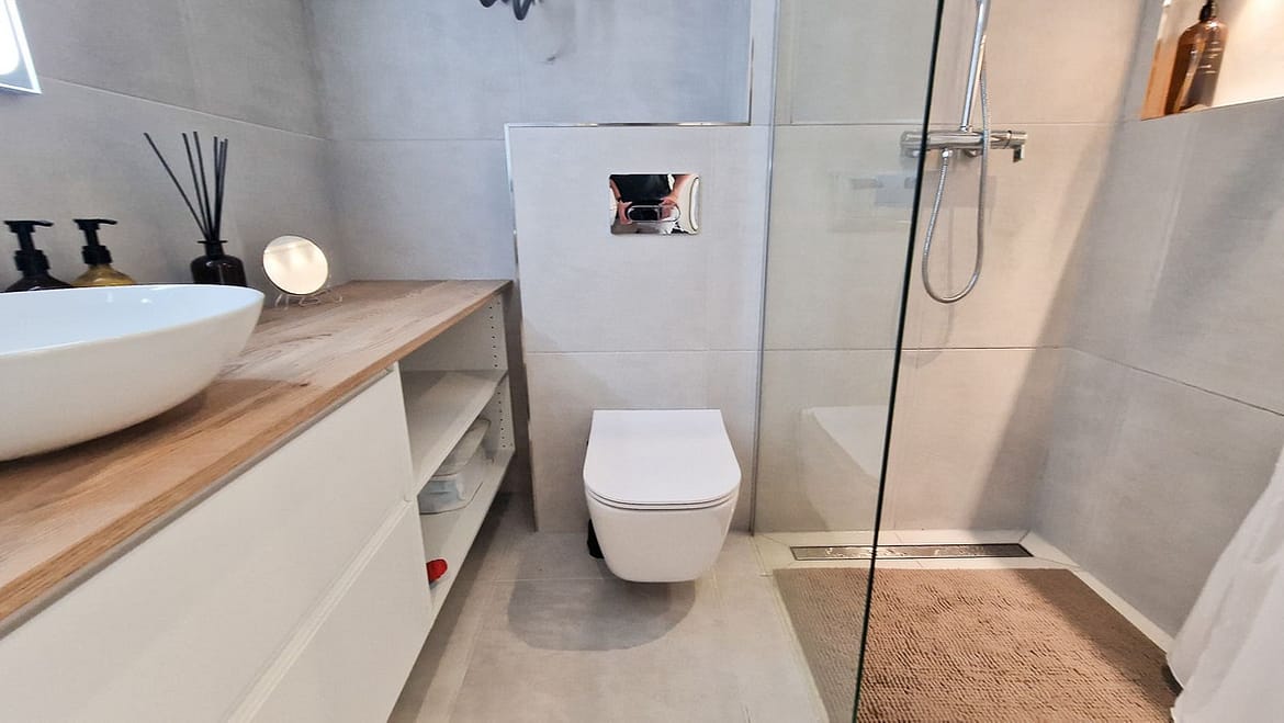 Luxury bathroom with efficient ventilation, wall-hung toilet, and stylish finishes