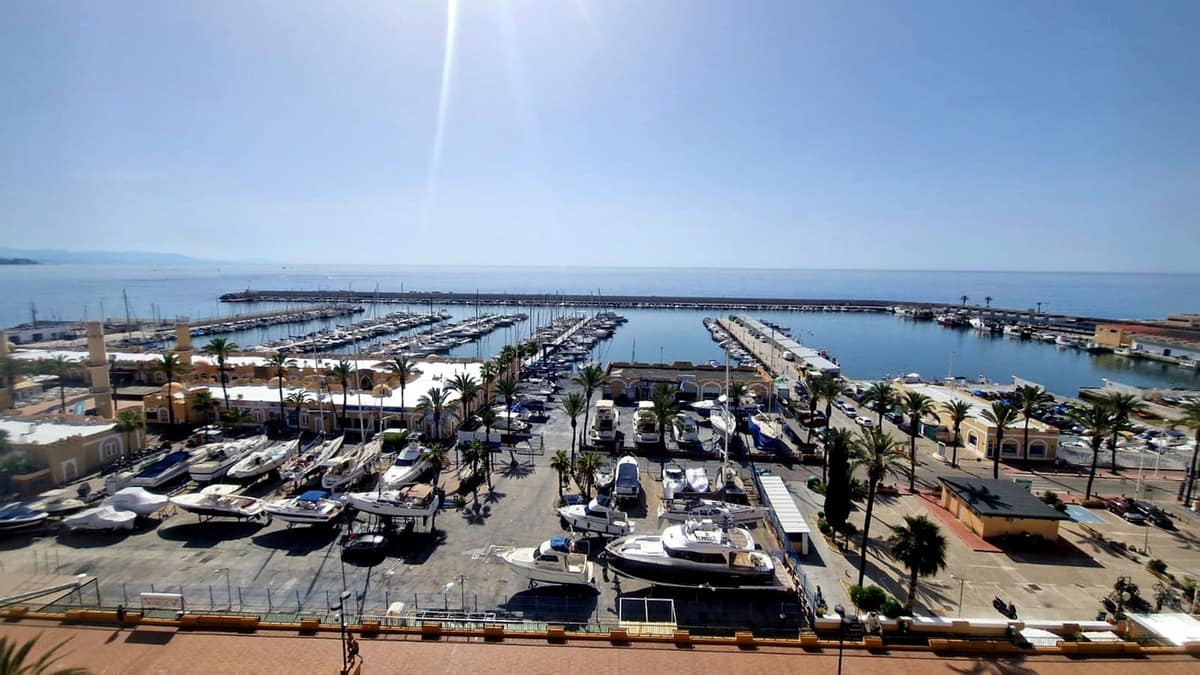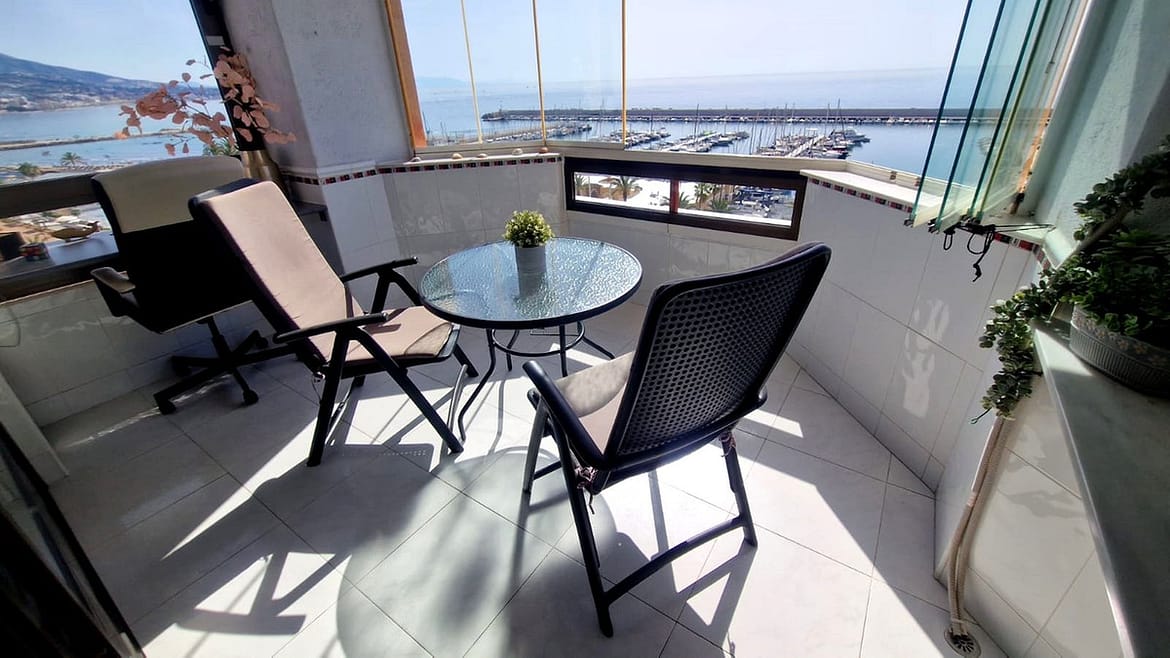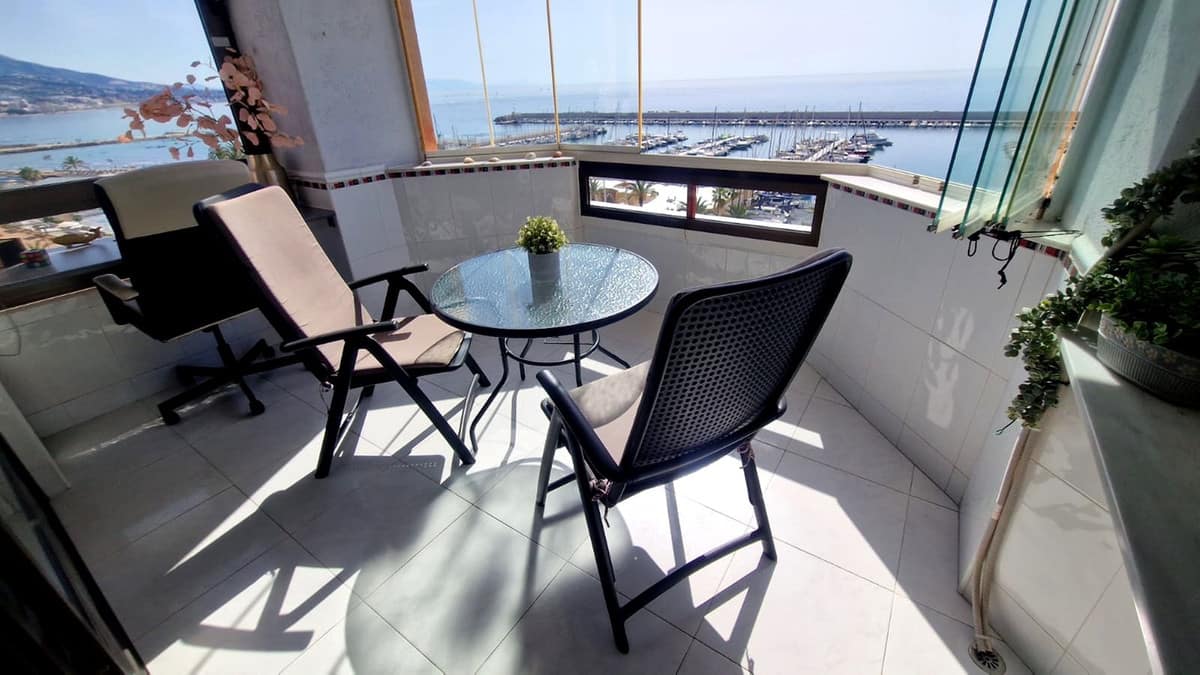 The property has a bedroom with fitted wardrobe and sea views, open plan modern fully equipped kitchen, and lounge dining with a sofa bed. The large terrace offers views to the marina, the coast and the mountains and has even a desk to work on line (if you can concentrate with the fantastic views!).
