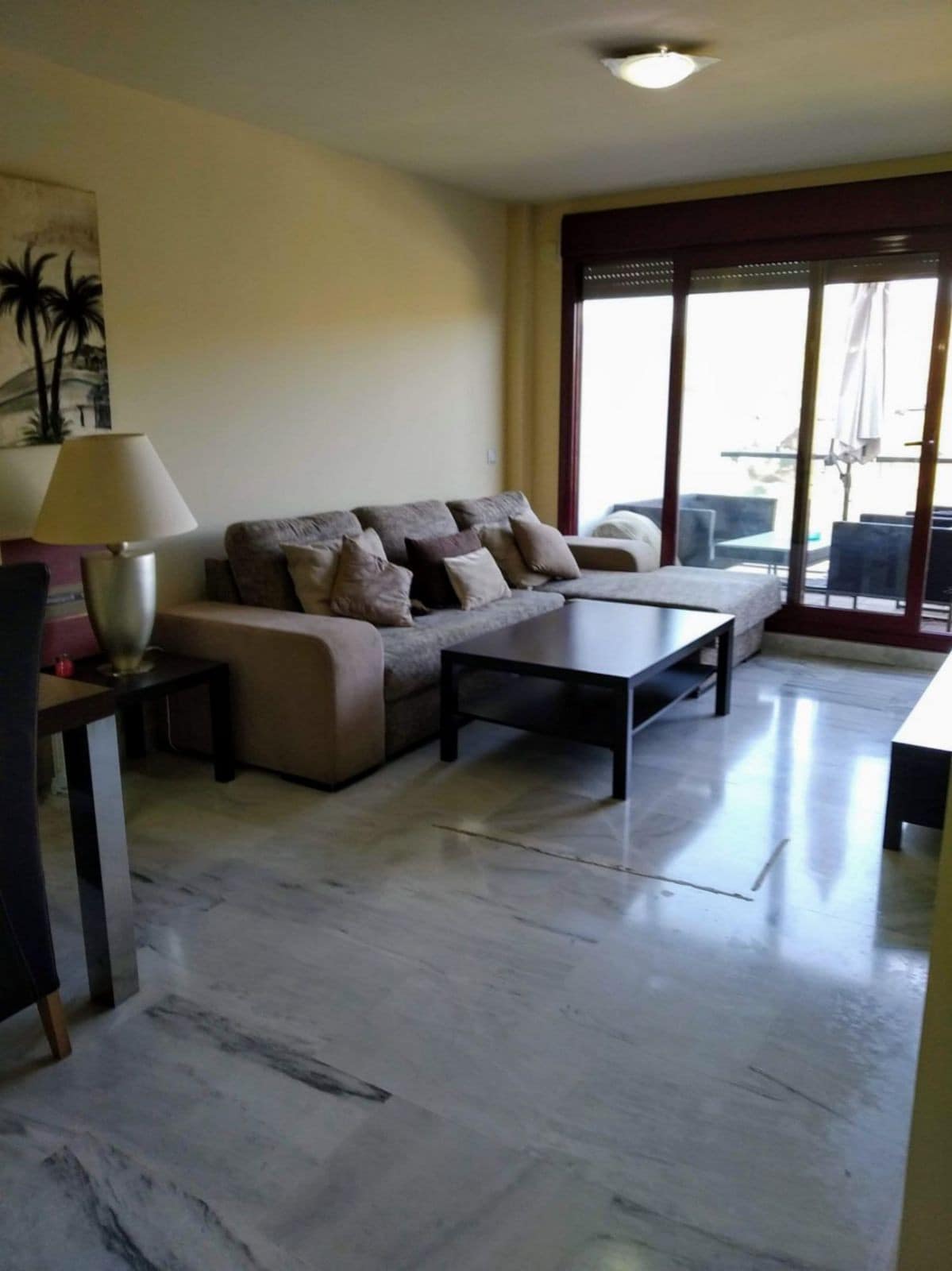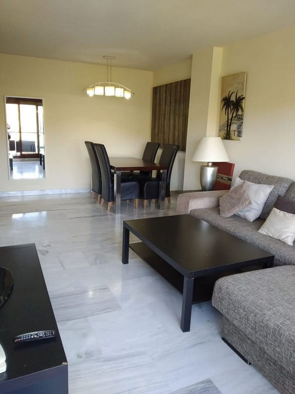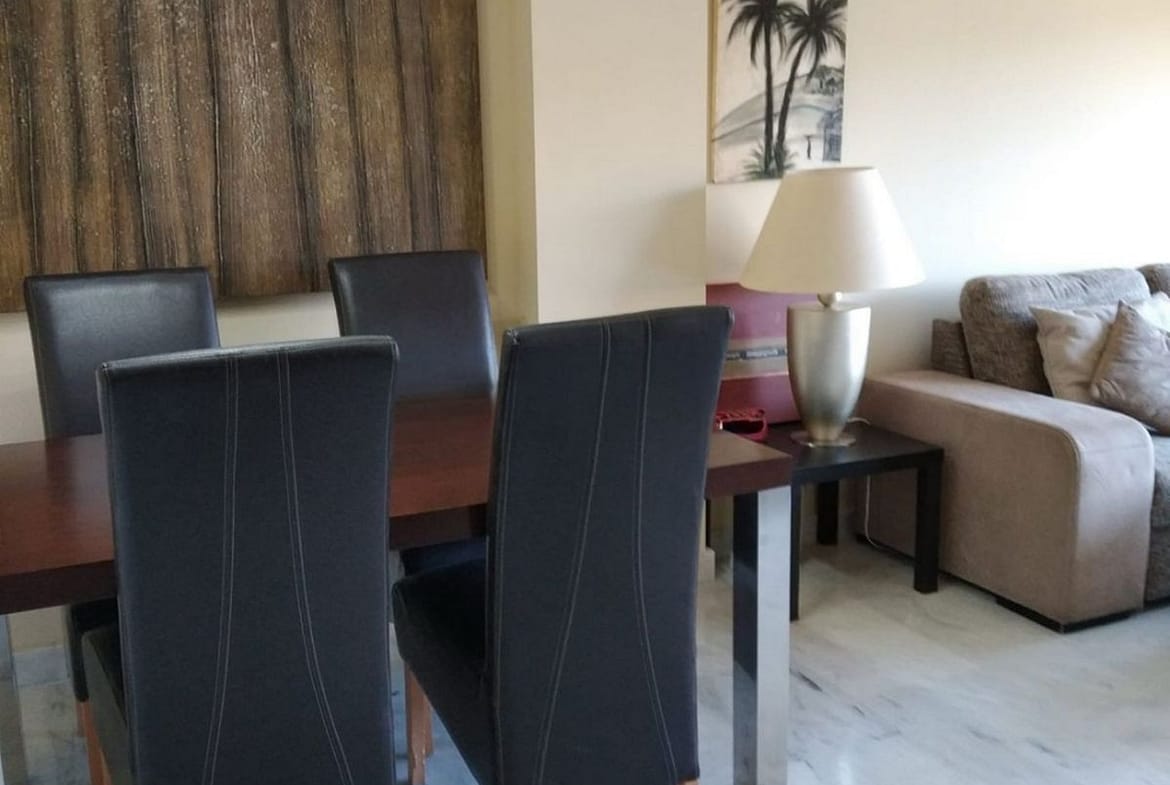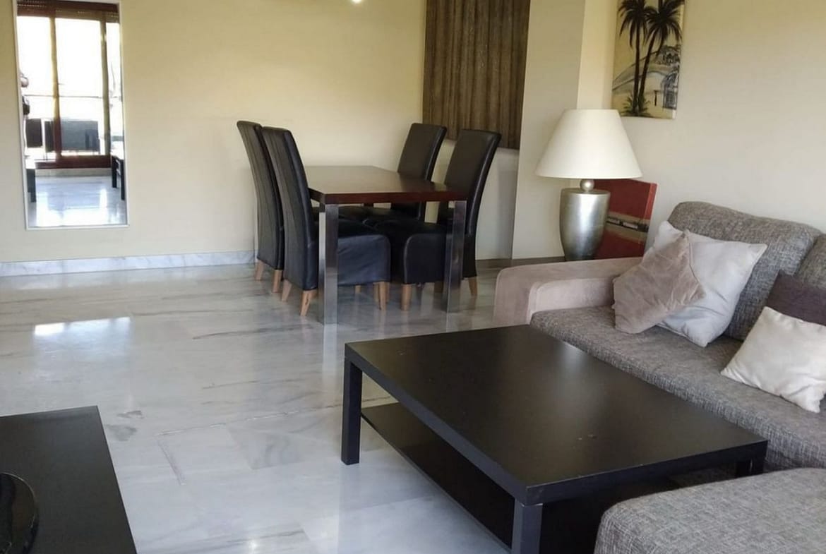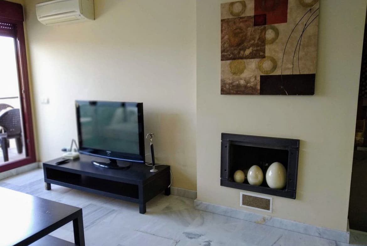 The apartment is fully furnished, with a living-dining room with direct access to the terrace. It has a chaise longue sofa, fireplace, television, table with chairs, and air conditioning.