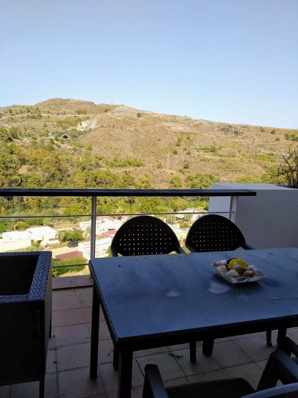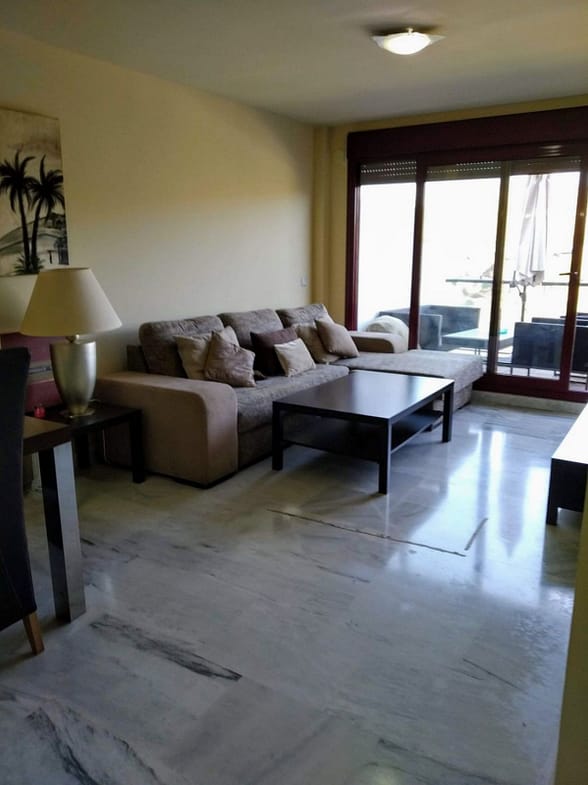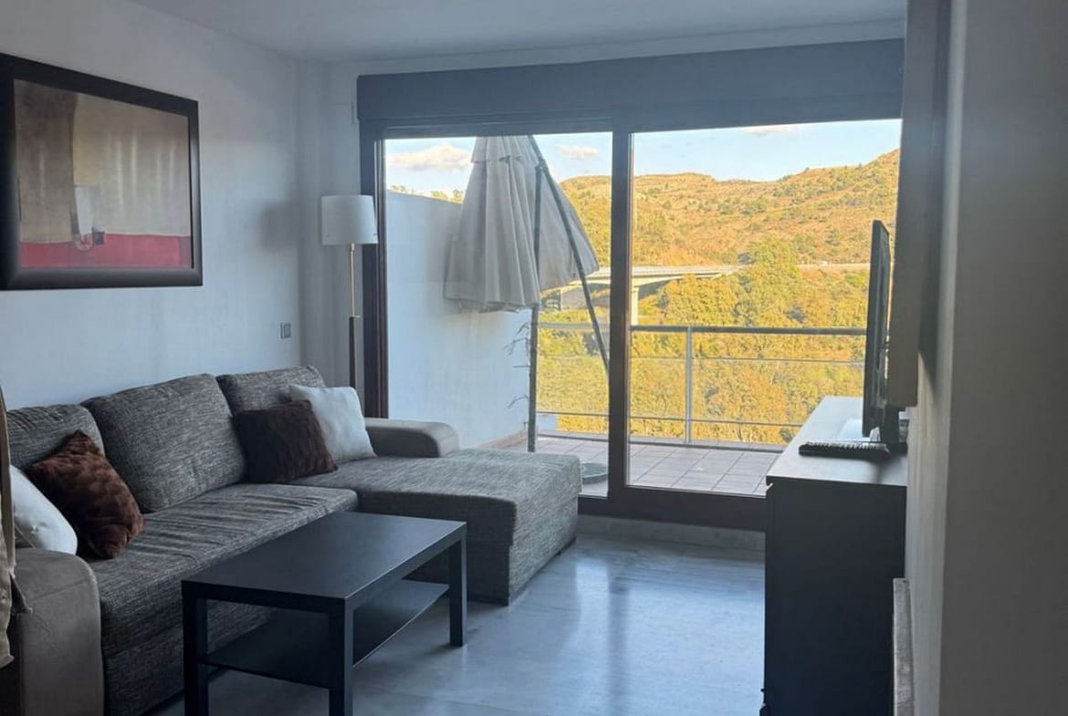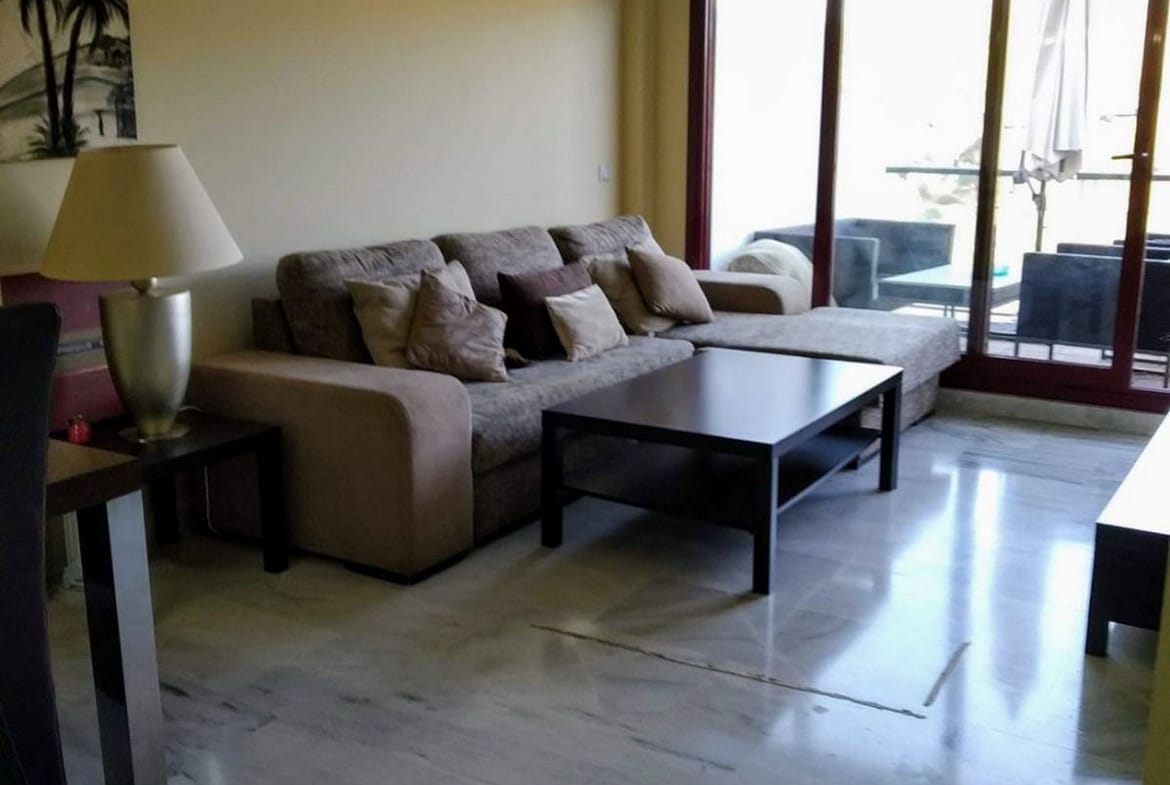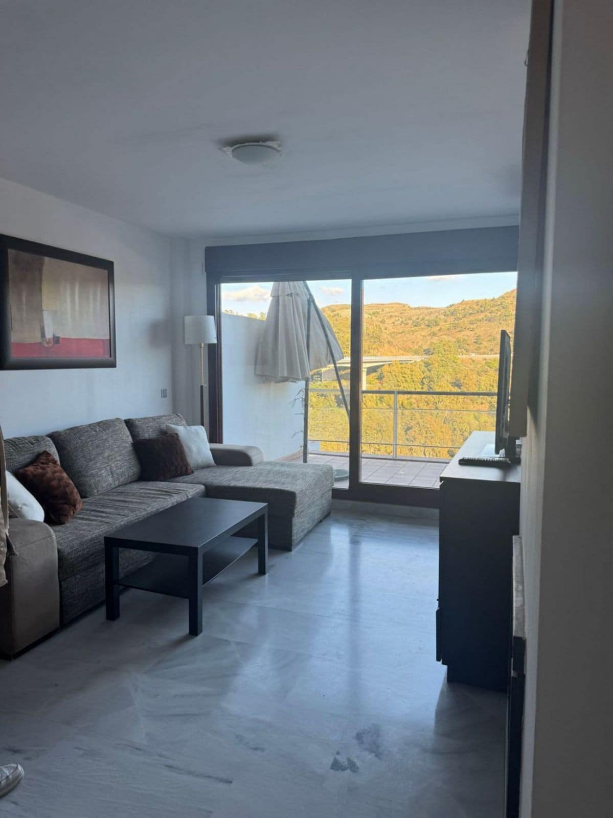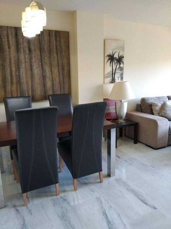 The apartment is fully furnished, with a living-dining room with direct access to the terrace. It has a chaise longue sofa, fireplace, television, table with chairs, and air conditioning.