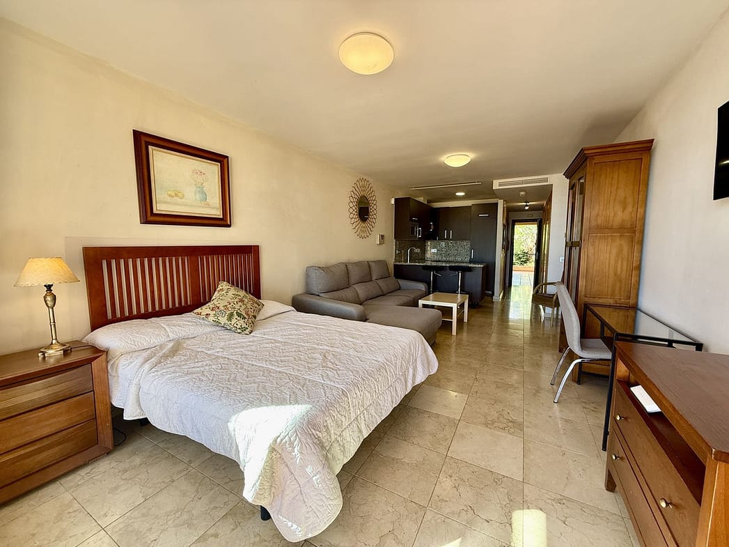 This 70-square-metre studio comprises a main room where it is possible to separate the bedroom area, the living-dining room and the kitchen. It has a spectacular south-facing terrace with sea views, and a parking space is included in the price.