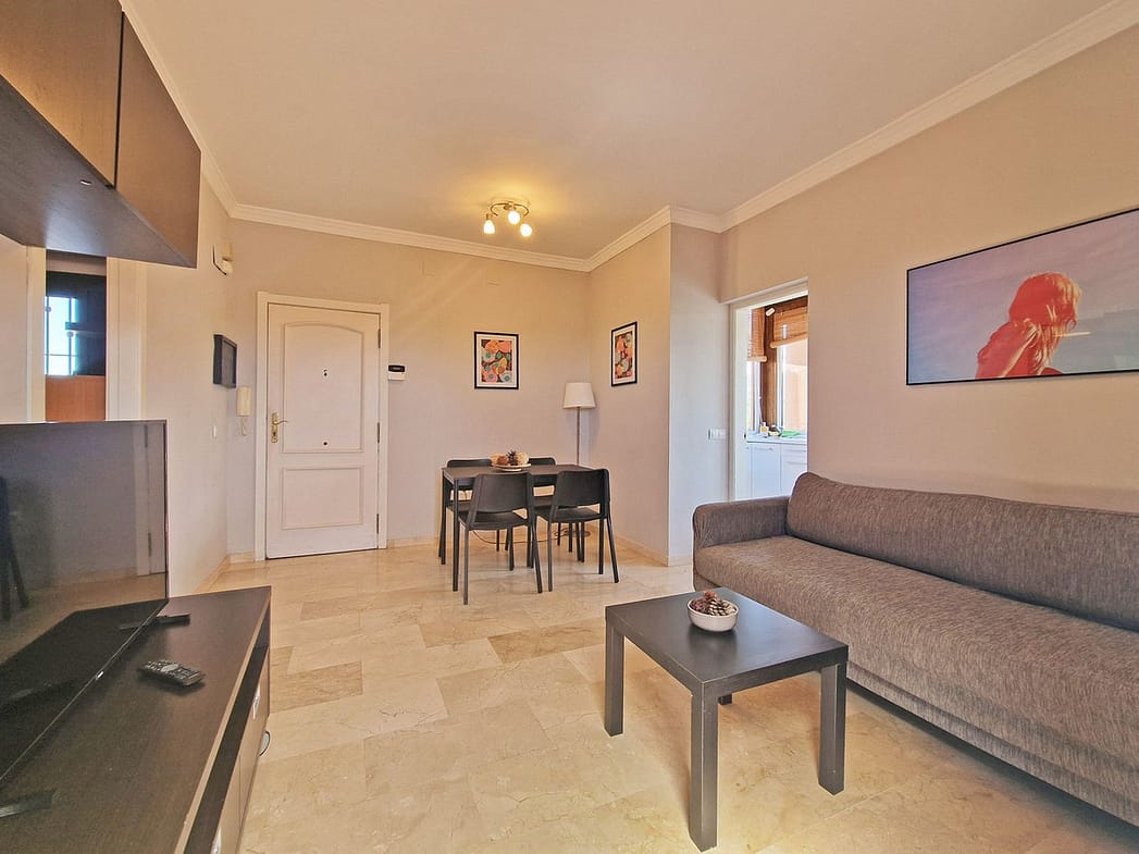 Set in a well-maintained urbanisation surrounded by lush gardens and mature trees, the complex features three communal swimming pools—the largest of which is directly in front of the apartment and visible from the kitchen.