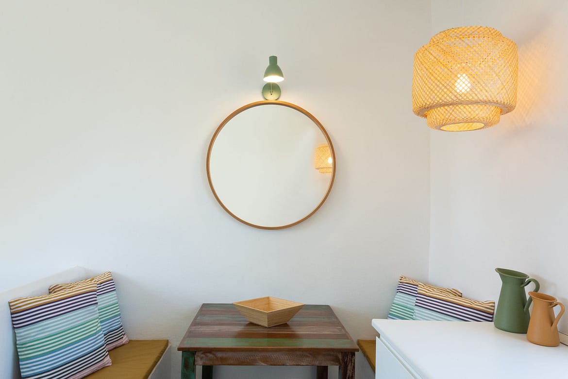Upstairs we have a kitchenette with breakfast corner and views over the main pool and the sea.