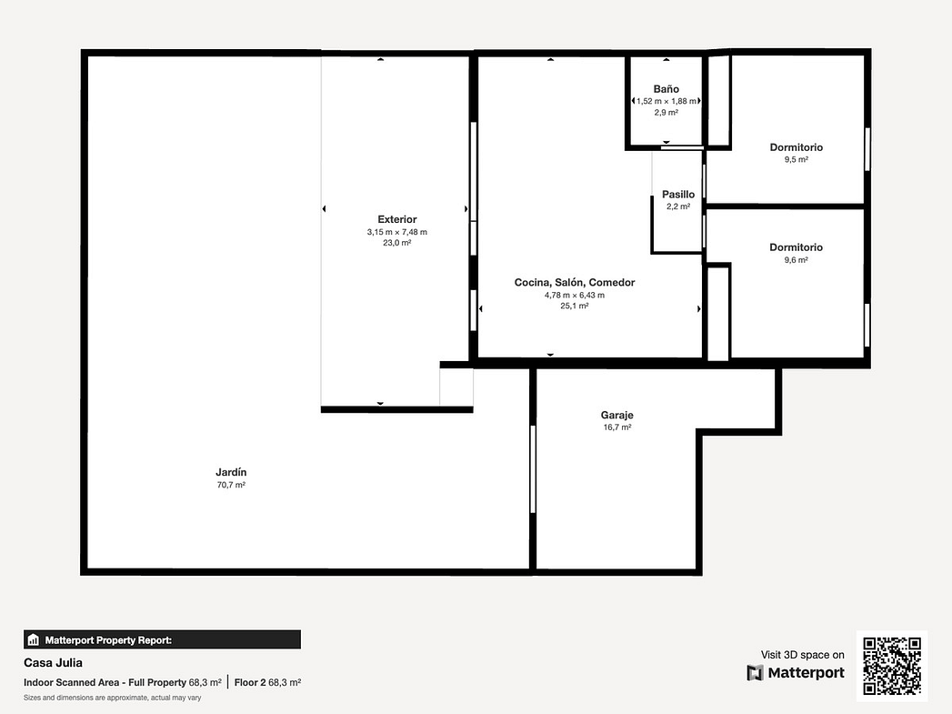 Additionally, the house offers two private parking spaces: one in a covered garage and another outdoors within the property.