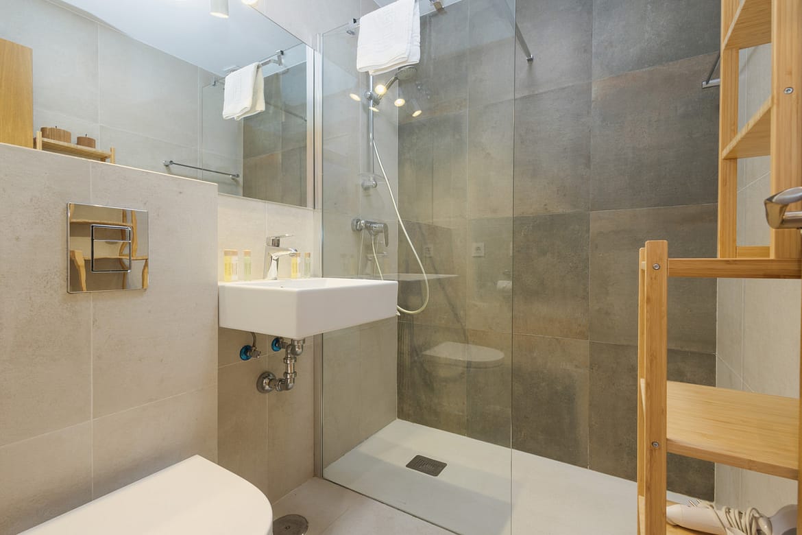 The bathroom is fully equipped with a shower, and there is also an outdoor toilet for added convenience, located in the garden area, where you’ll find a washing machine and a dryer.