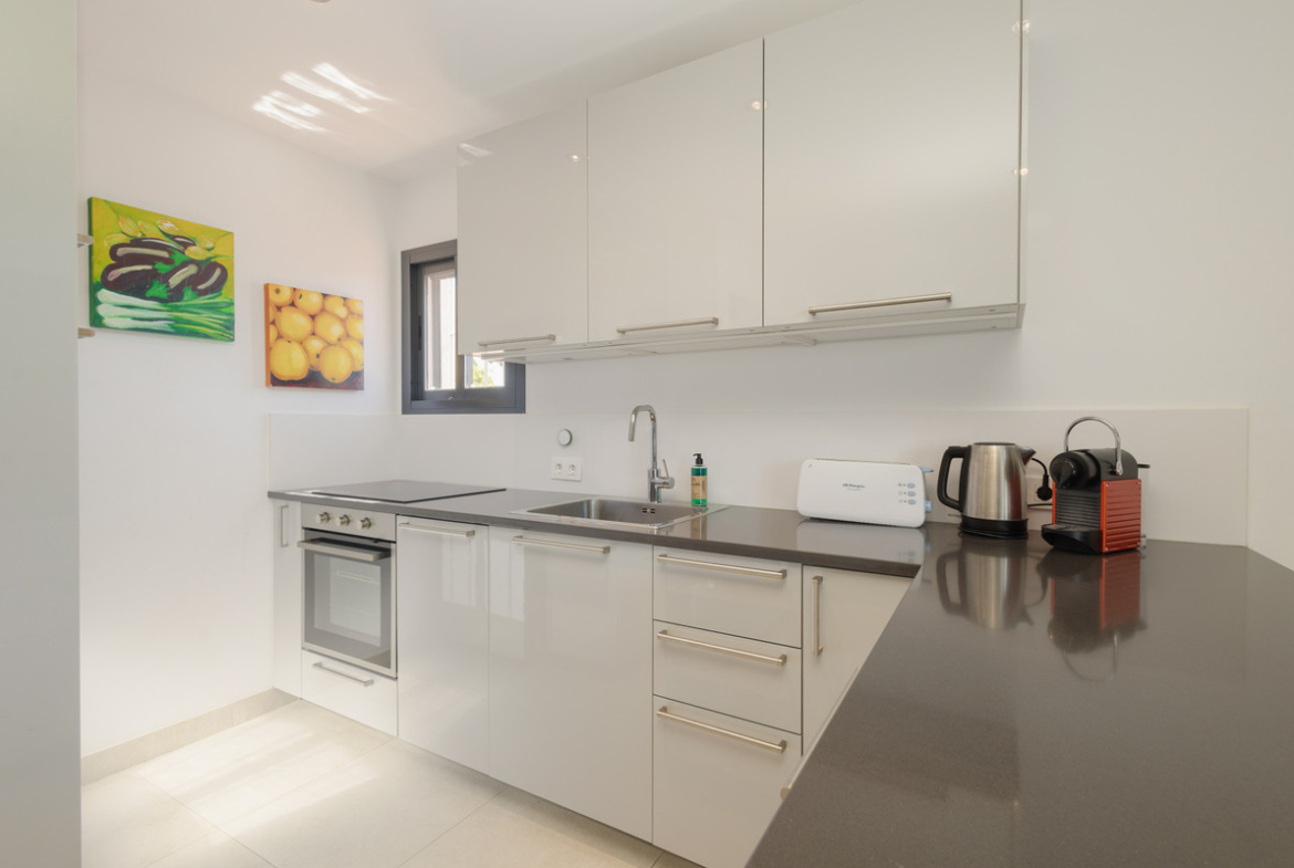 The open-plan kitchen is fully equipped with an oven, refrigerator, coffee maker, kettle, and all necessary cookware.