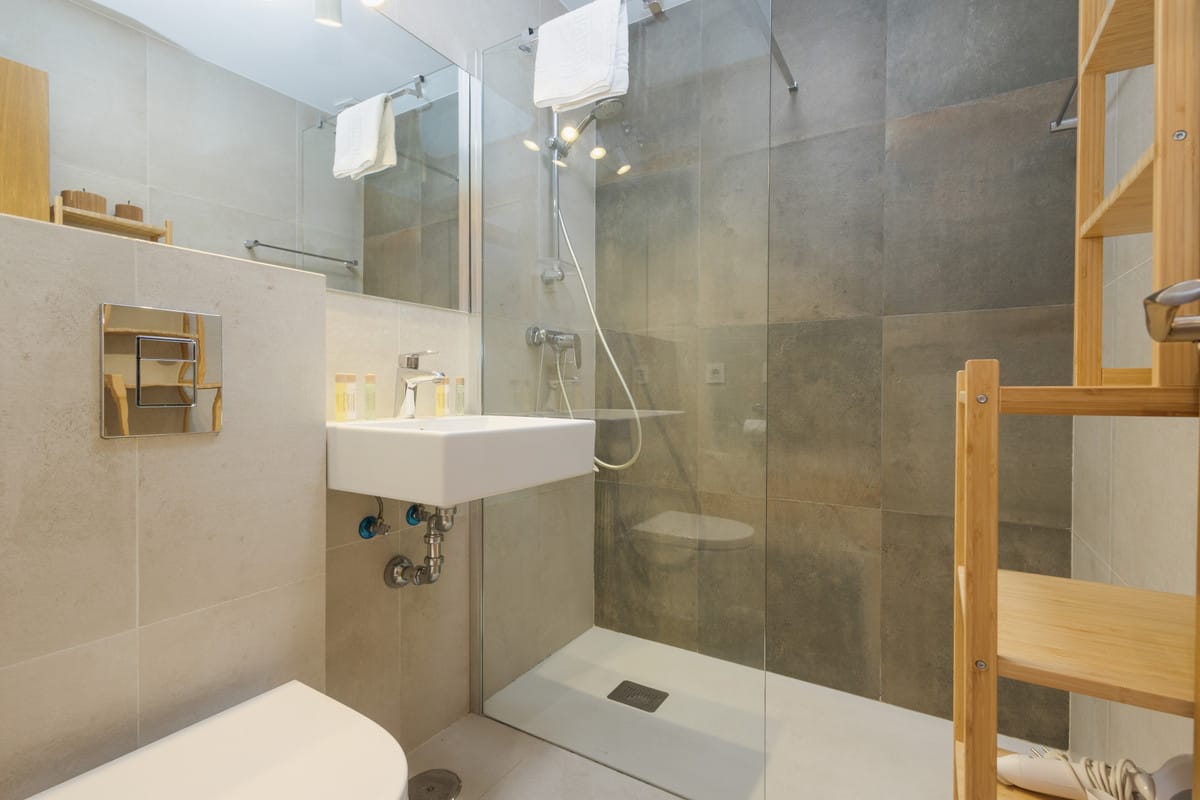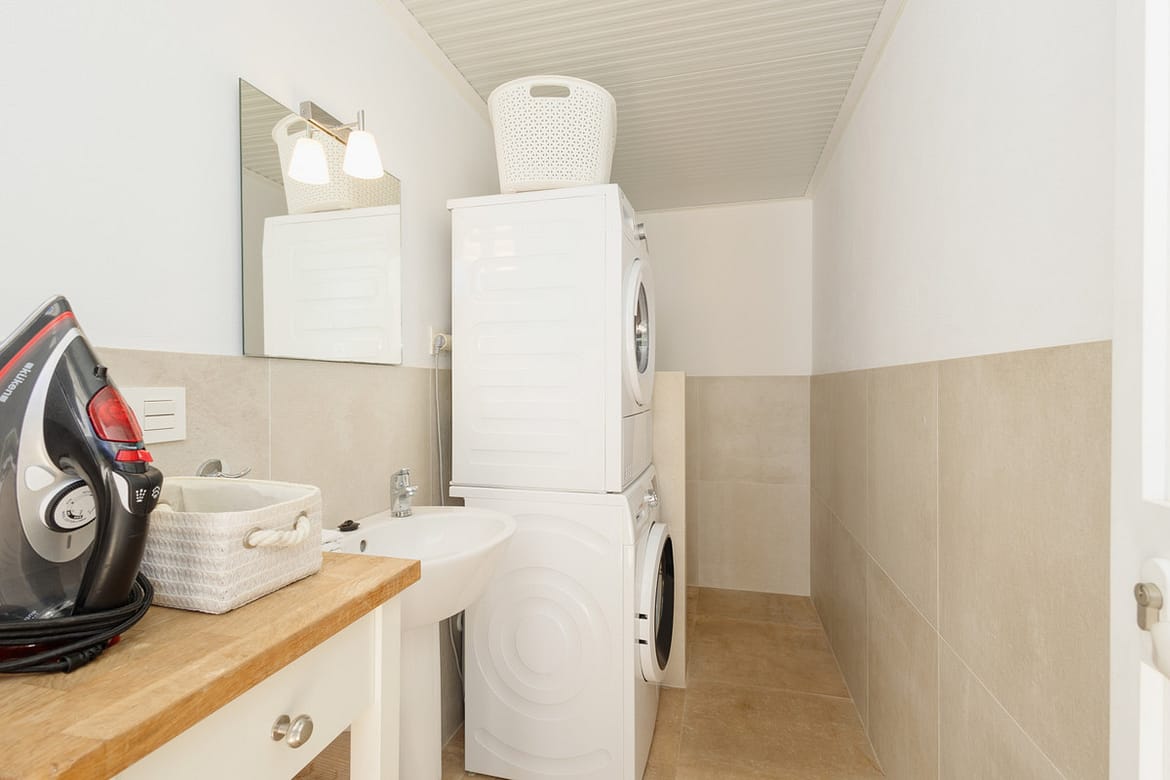 Practical amenities include underfloor heating in bathrooms, fiber optic internet, washing machine, dryer, and two private parking spaces – one covered garage plus an outdoor space. The property is fully furnished and equipped for immediate occupancy.