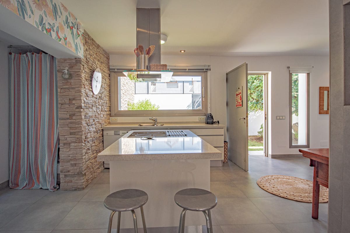 The fully equipped open-plan kitchen maintains the aesthetic consistency with the rest of the house: light-colored materials, straight lines, and a layout designed for everyday comfort. Ideal for long stays and for those who value practicality without compromising on design.