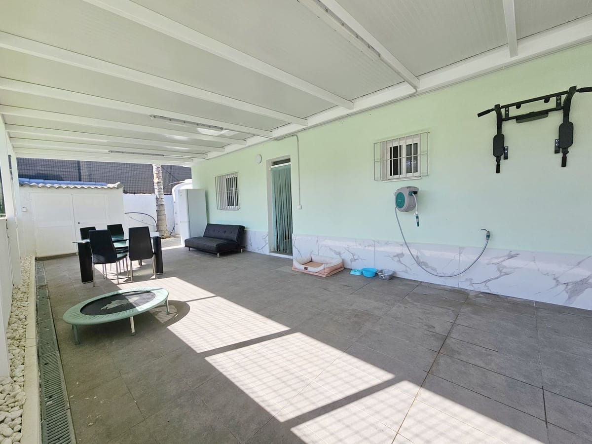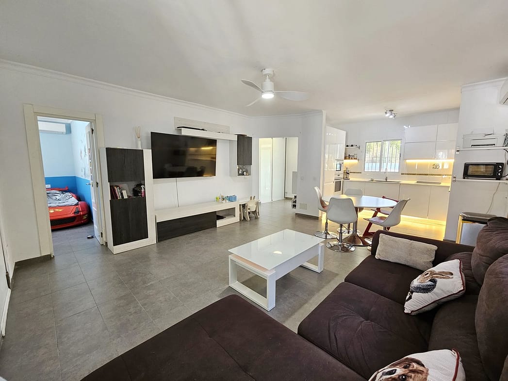 The villa is arranged on one level and comprises two bedrooms and two bathrooms. Inside, you’ll find a bright, modern interior with an open-plan layout and a brand-new fitted kitchen. Natural light fills the home, creating a spacious and airy feel throughout. The property can be accessed from both the front and the rear. Entering through the main door, you step into a generous lounge and dining area leading to the kitchen. Off the lounge is the first double bedroom, currently used as a child’s room, complete with fitted wardrobes and ample space. A short hallway, with additional storage wardrobes, connects to the master bedroom—a large, comfortable space with fitted wardrobes and a stylish en-suite bathroom featuring a walk-in shower. Adjacent to the master is the family bathroom, fitted with both bath and shower. Both bathrooms have been recently renovated to a very high standard.