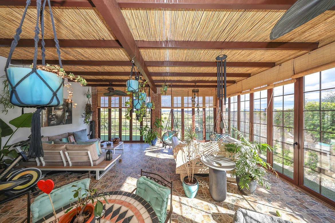 The kitchen is also located to the right and benefits from direct access to both the lounge and the spacious covered terrace. This terrace is a standout feature of the property—an ideal entertainment space with large windows that flood the area with natural light, creating a bright and airy atmosphere. Patio doors open onto the garden, pool area, and those stunning open views.