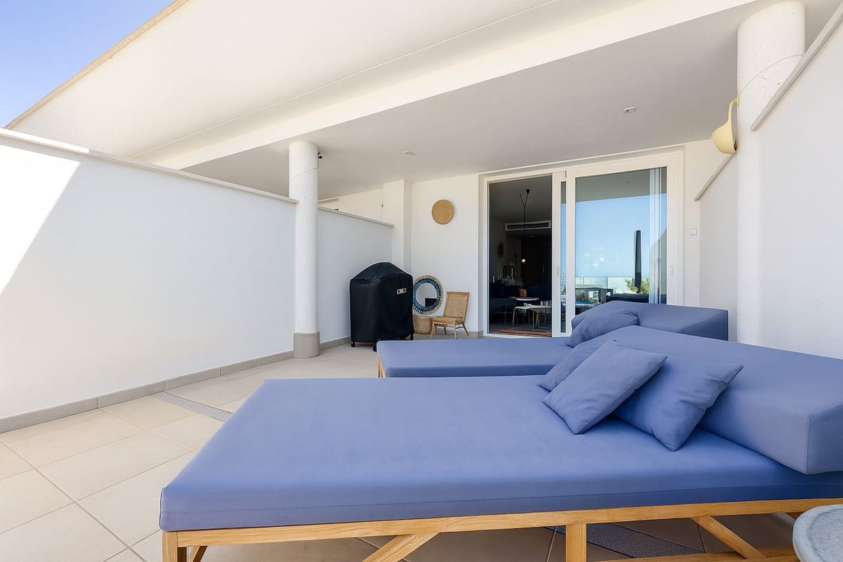 The terrace on the ground floor is 31.5 m², of which 11.4 m² is covered, here you can enjoy the sun from the morning until it sets. The large size of the terrace makes it possible to have lounge furniture, a large dining table, sunbathing, there is also the possibility of a cold bath undisturbed by neighbours. In the evening, there is the opportunity to see the sun set behind the Mijas mountains, as well as a view over the Mediterranean Sea, Fuengirola town and the mountain peaks. In addition, there is a nice large well-functioning kitchen and toilet.