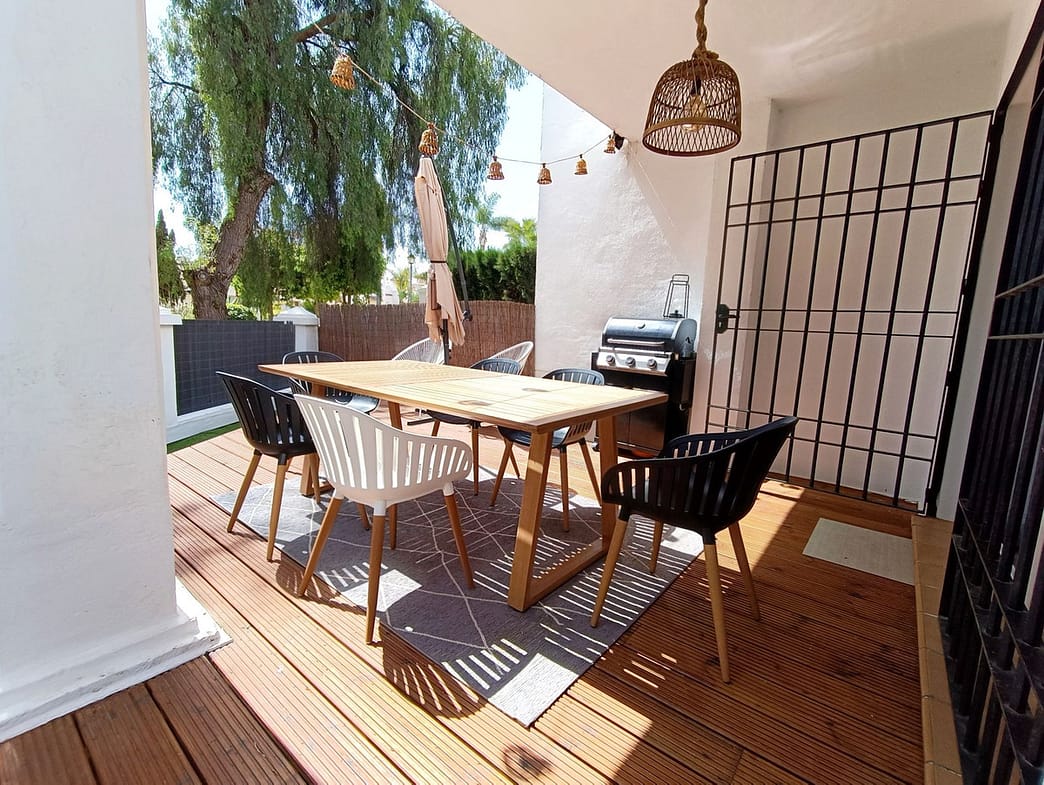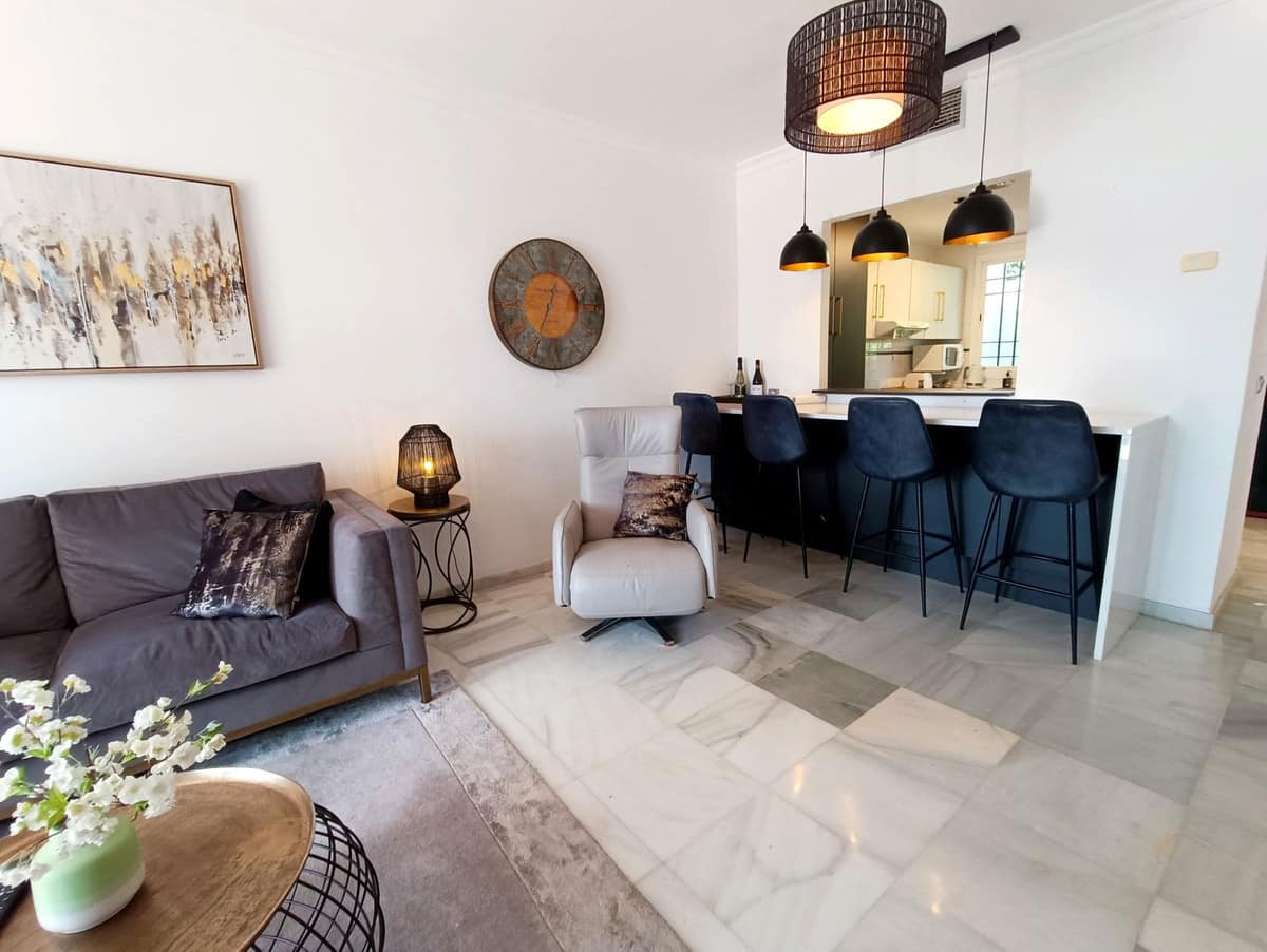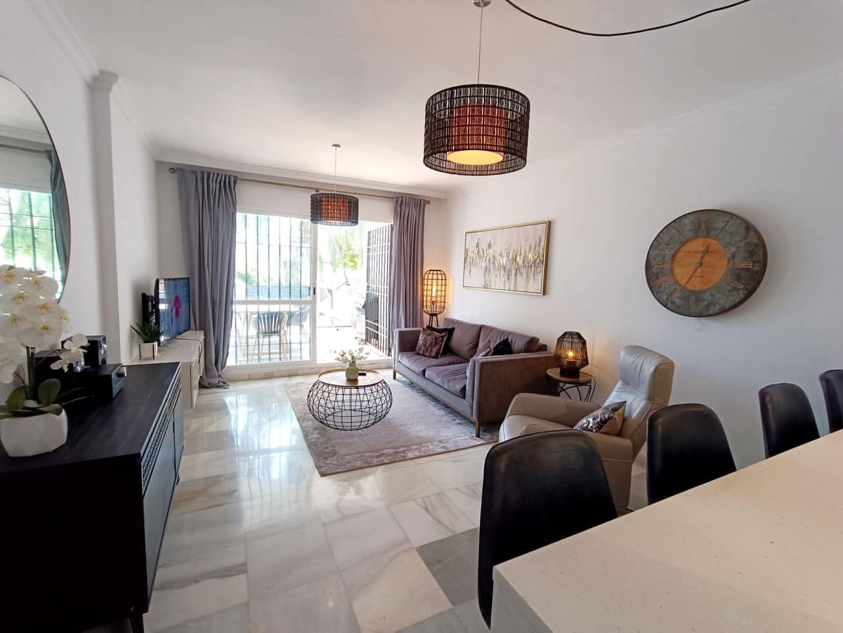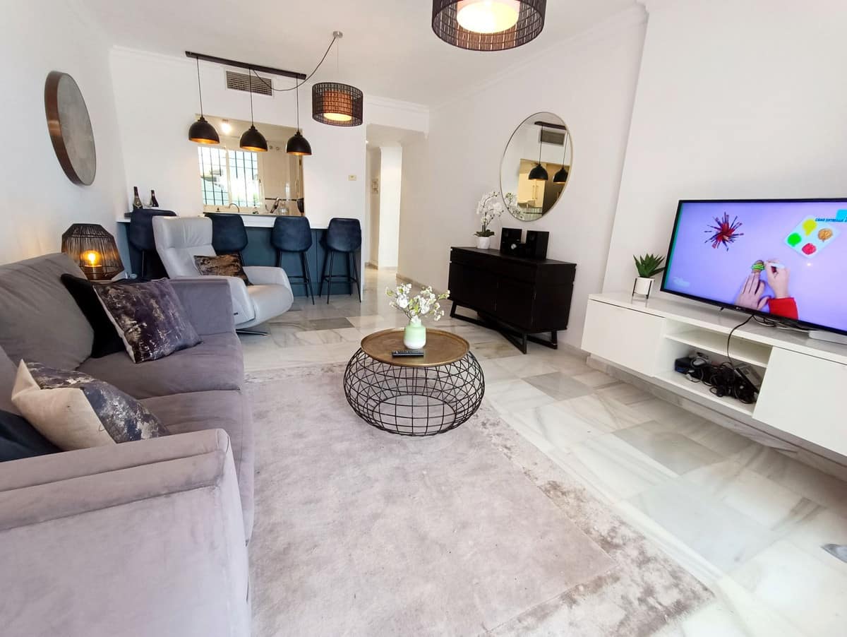 This cosy 2 bedroom 2 bathroom ground floor apartment is in a secure gated urbanization in the heart of Nueva Andalucia. The property is equipped with everything you could need for your holiday on the Costa del Sol.