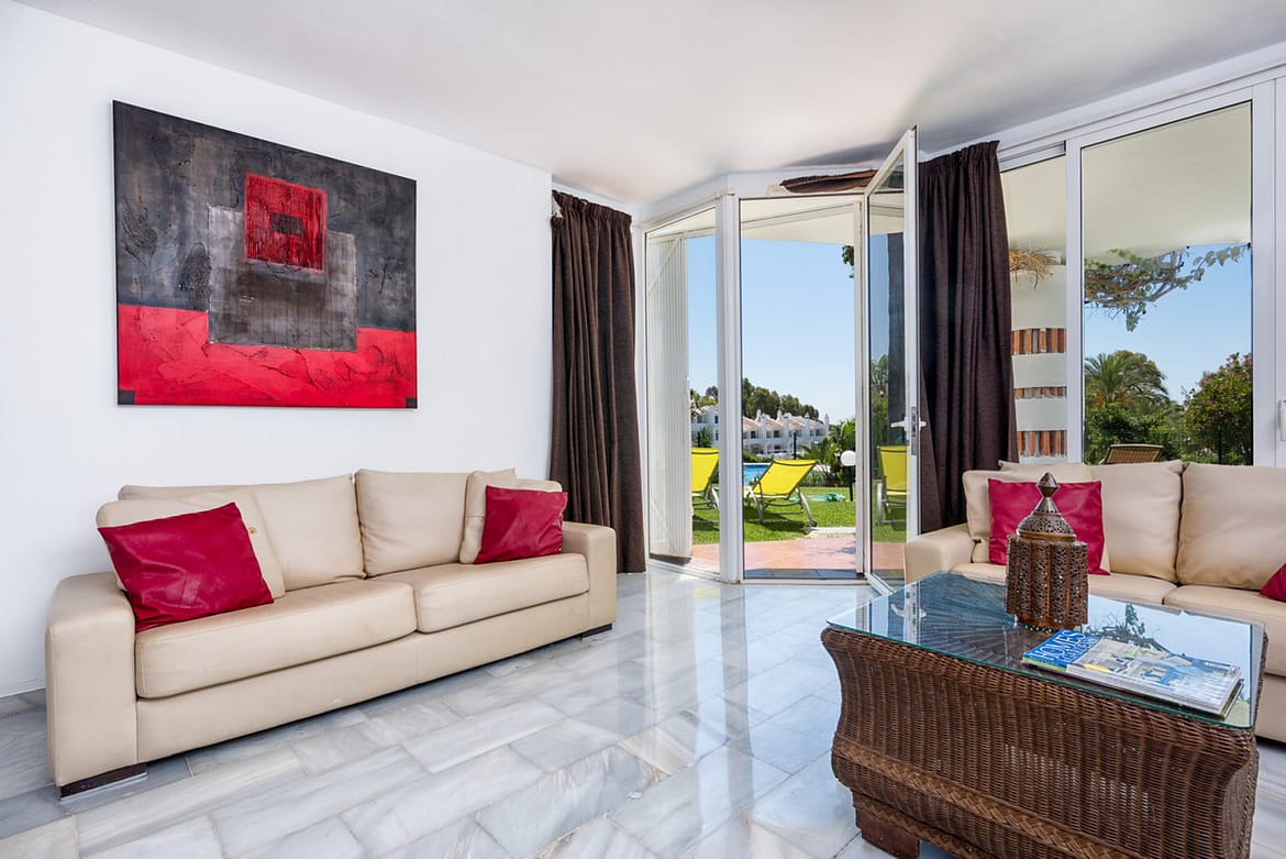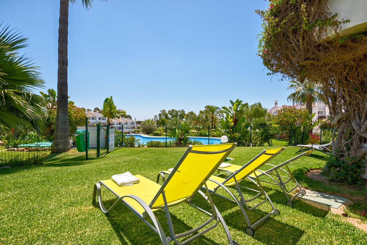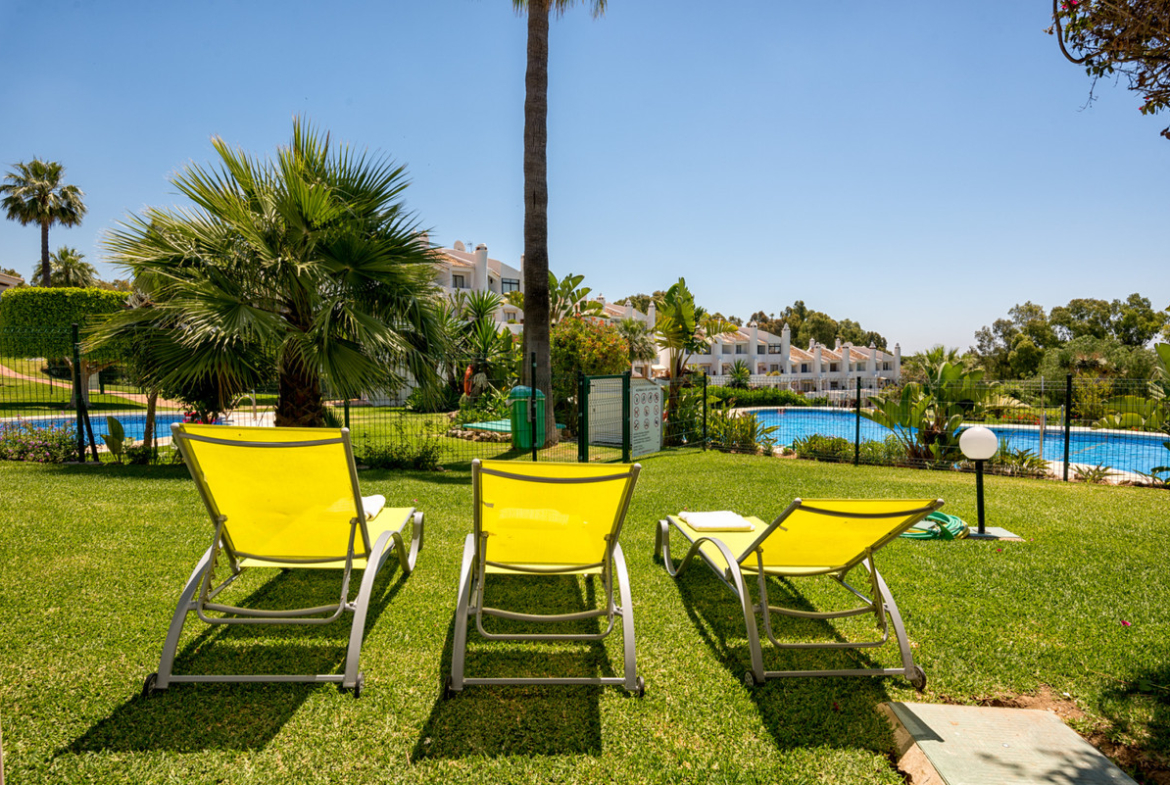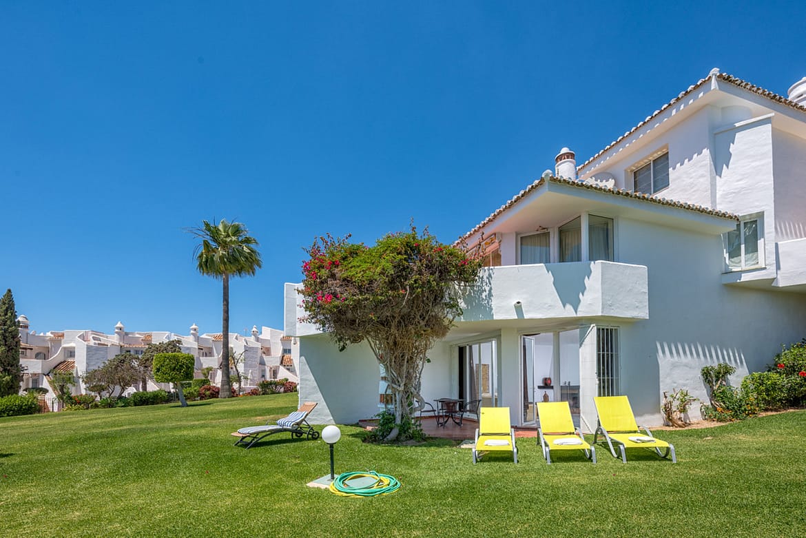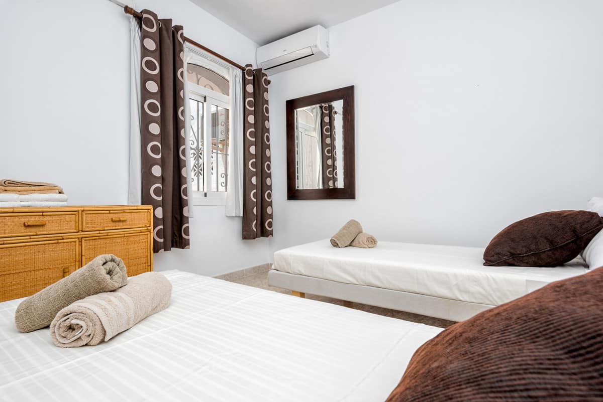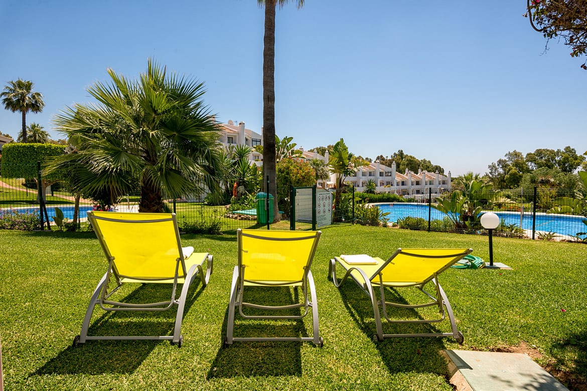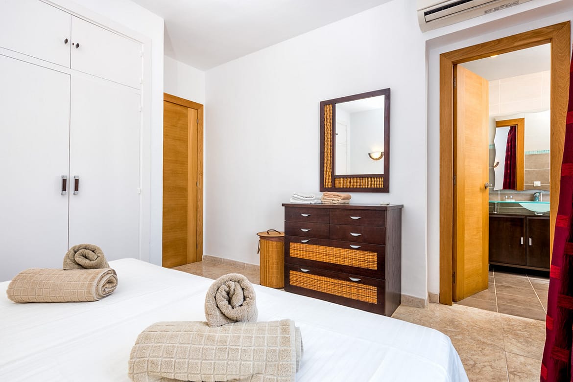2 bedroom, 2 bathroom ground floor apartment. Jardines de Calahonda Phase 3 offers possibly some of the best landscaped tropical gardens in Calahonda. Choose between the two beautiful pools on the complex, one with a children’s pool for the younger “water babies”. Or why not use both! Situated in the lower western border of Calahonda amidst tranquil settings yet within 10 minutes walk of the beach, shops, bars, restaurants and all facilities which makes Jardines de Calahonda an ideal holiday destination for families, couples and groups. Jardines has its own local neighbourhood on-site bar, handy for enjoying a refreshing drink, a light snack or an ice cream. This 2 bedroom, 2 bathroom apartment has been refurbished creating modern bathrooms and kitchen. There is complementary WIFI and internet enabled TV and Air conditioning throughout. Perfect for families. A cot and highchair are provided free of charge.