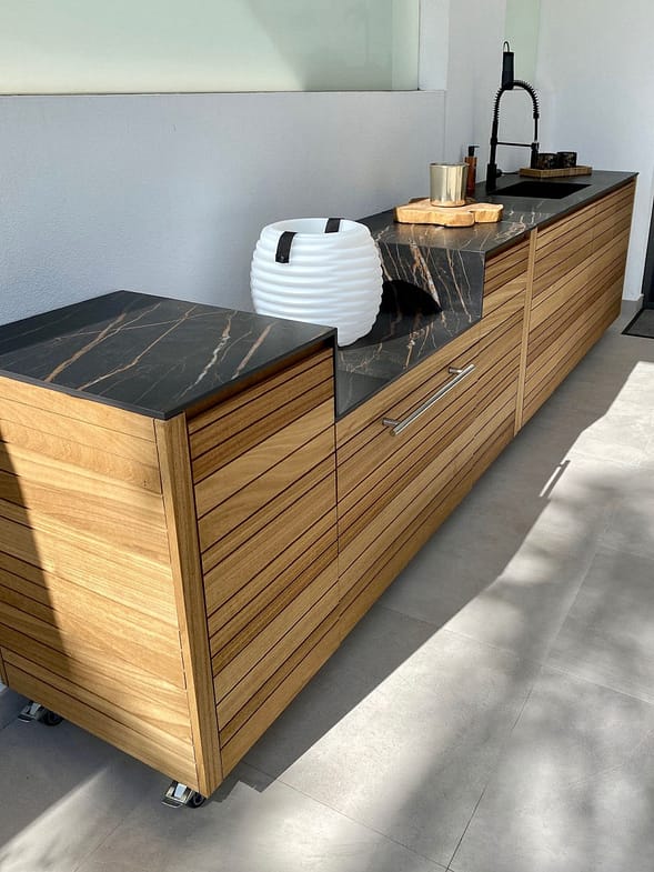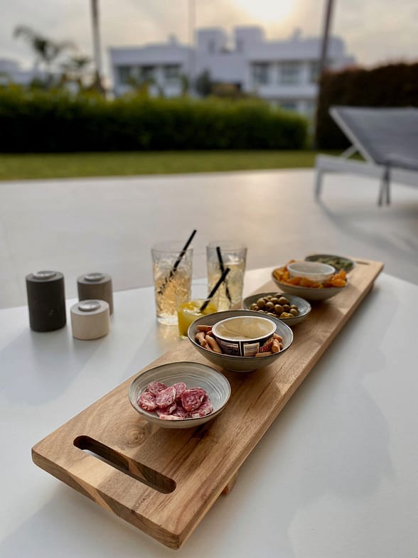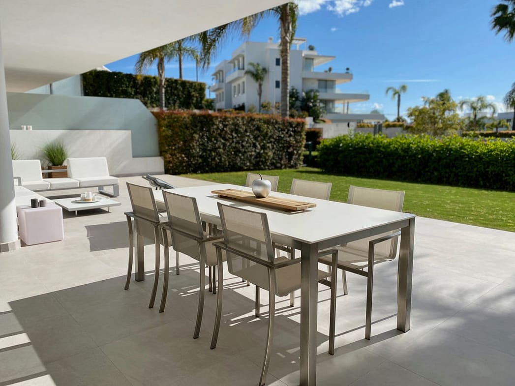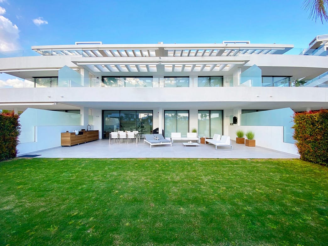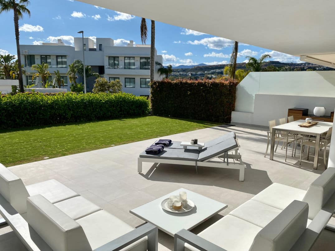The apartment consists of two bedrooms: the master includes a king-size bed, an en-suite bathroom with a walk-in rain shower, and a dressing area, while the second bedroom has twin beds and its own bathroom. The expansive 82m² terrace boasts garden views, a dining area, an outdoor kitchen, and sun loungers.