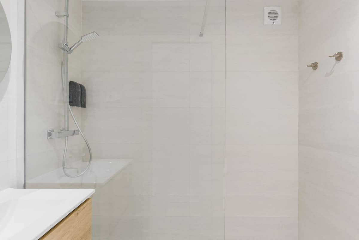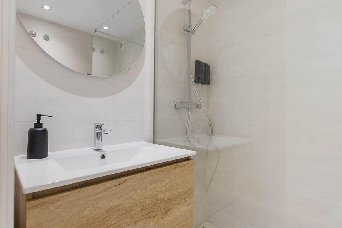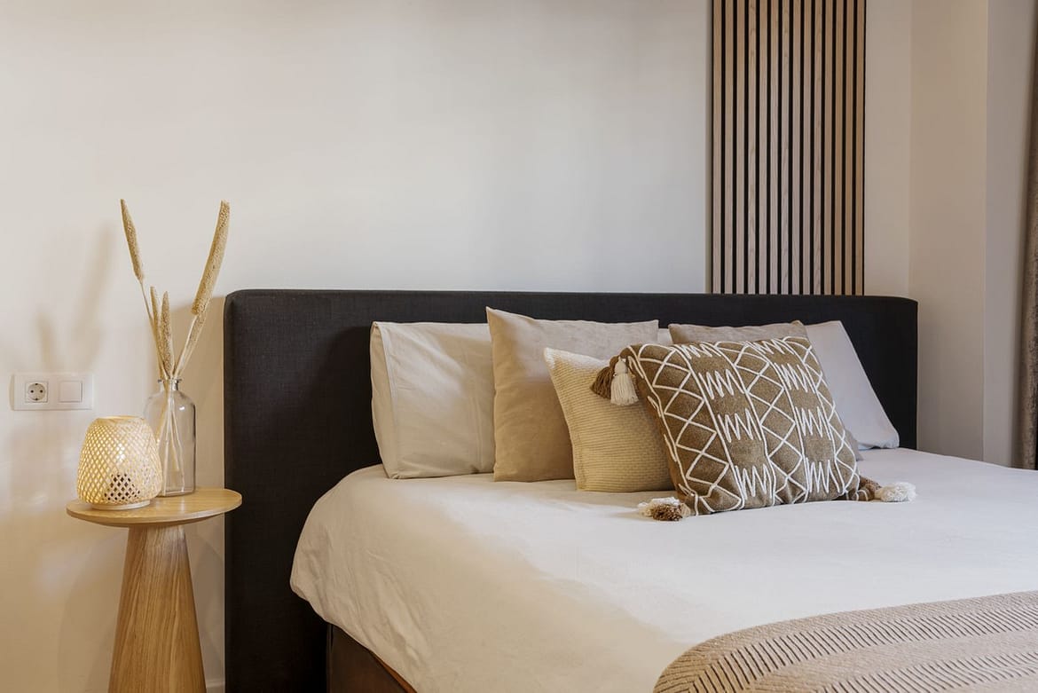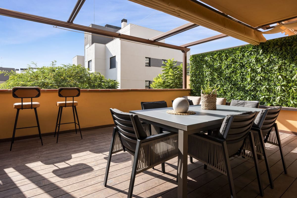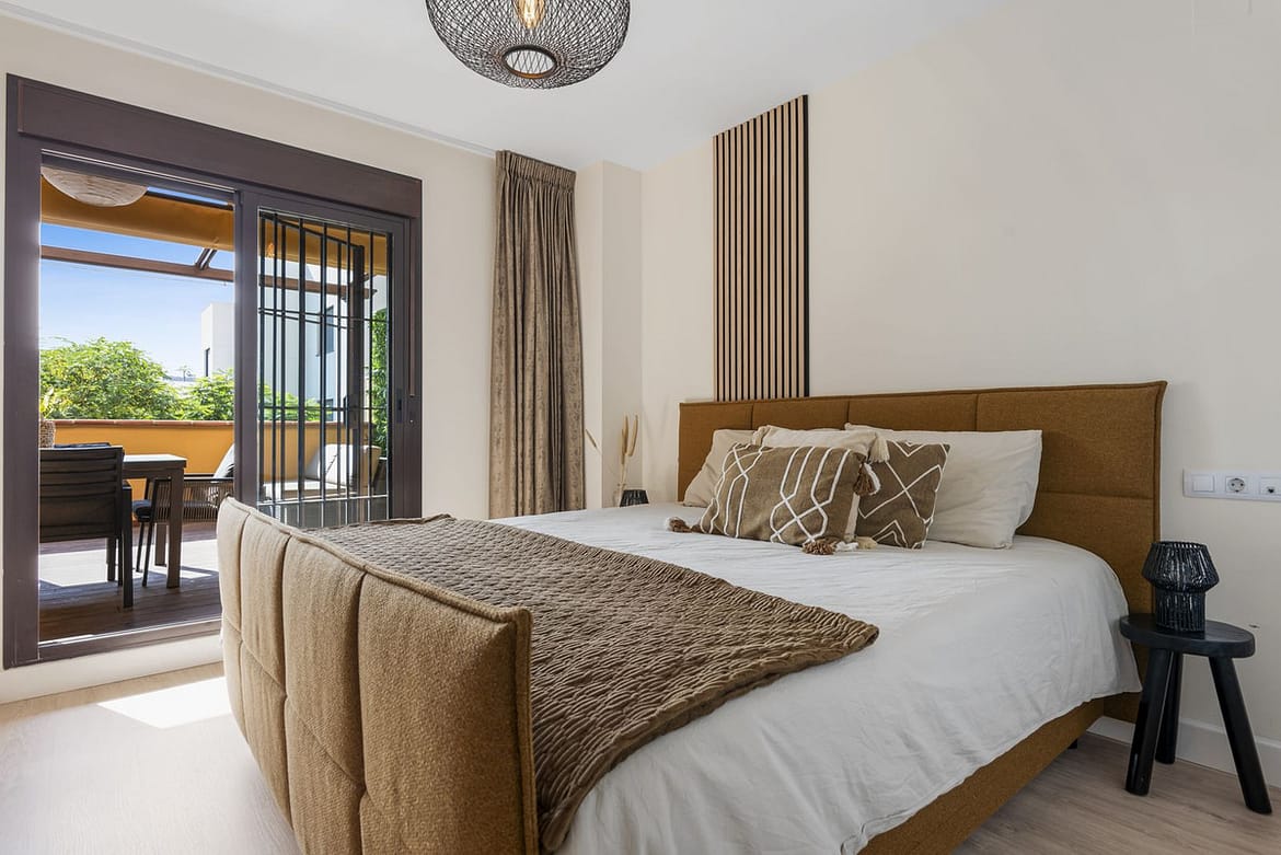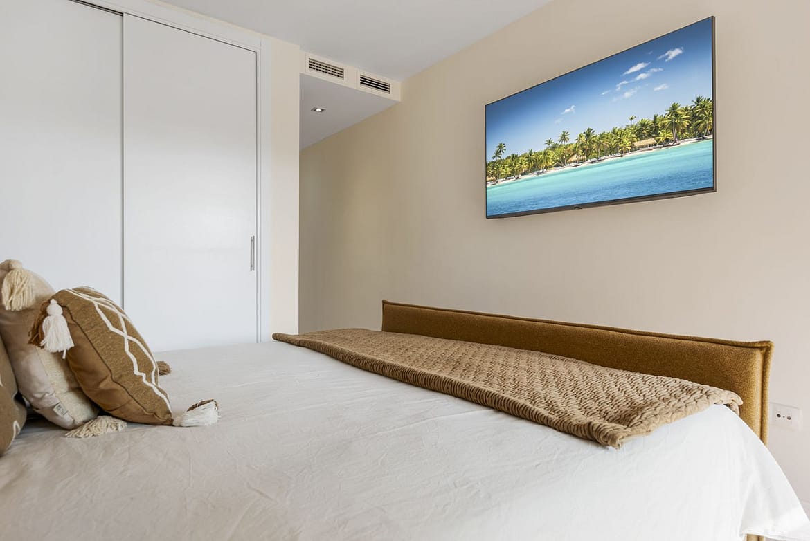 The master bedroom benefits from a double bed, fitted wardrobes, an en suite bathroom with a bath and shower attachment and has access to the terrace. The guest bedroom offers a double bed, fitted wardrobes and has access to the east facing terrace. There is a guest shower room.