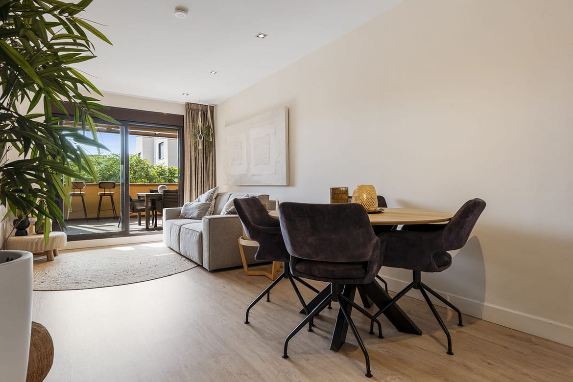 The apartment is located on the elevated ground floor and is arranged over one level. There is access from the underground parking to the apartment by lift. The open plan living space is furnished with a dining table and chairs and a lounge seating area with a large L shaped sofa and a smart TV. The lounge area leads out to the covered terrace where a further lounge seating area can be enjoyed. The separate kitchen is fully equipped.