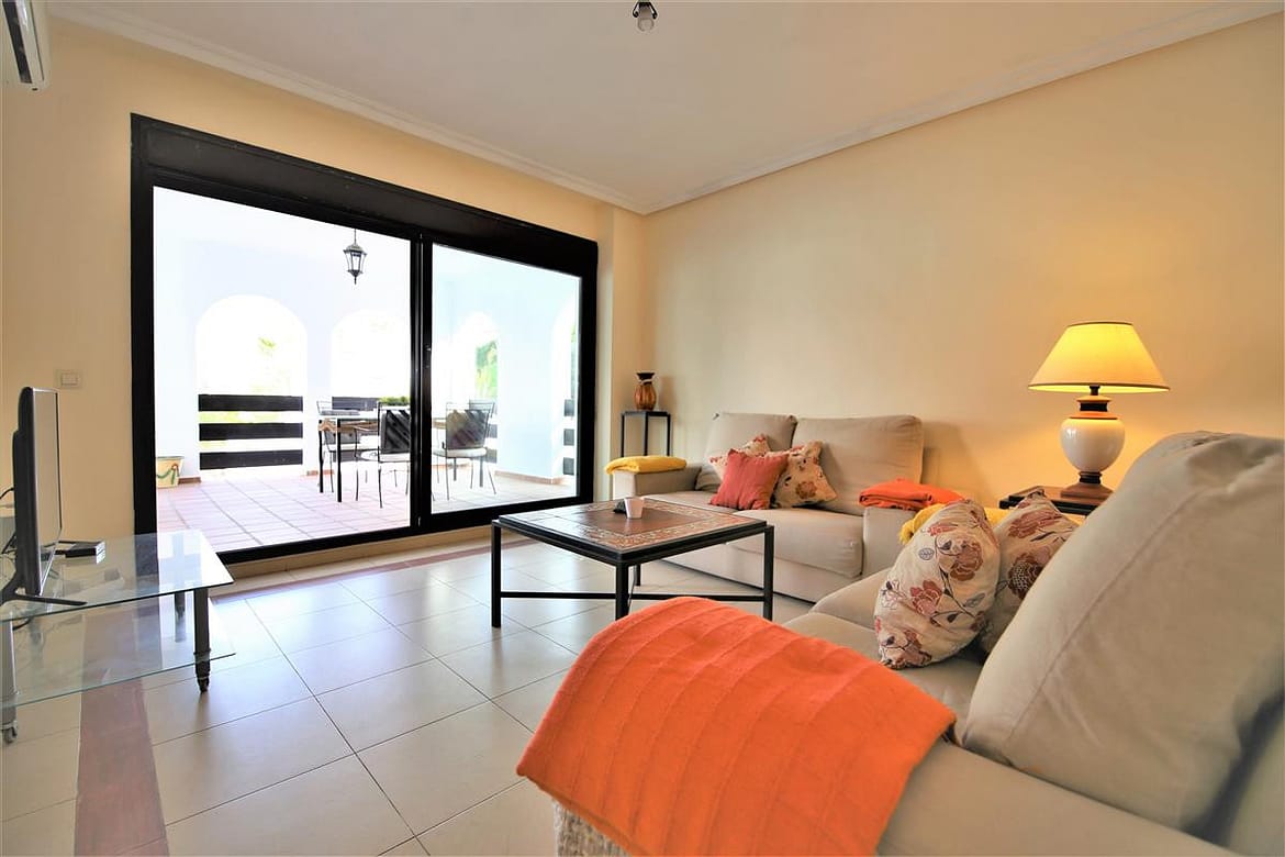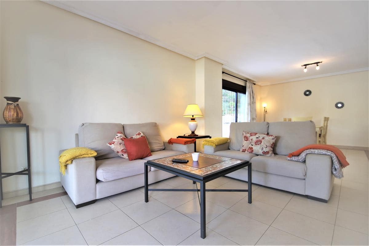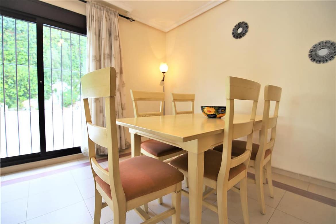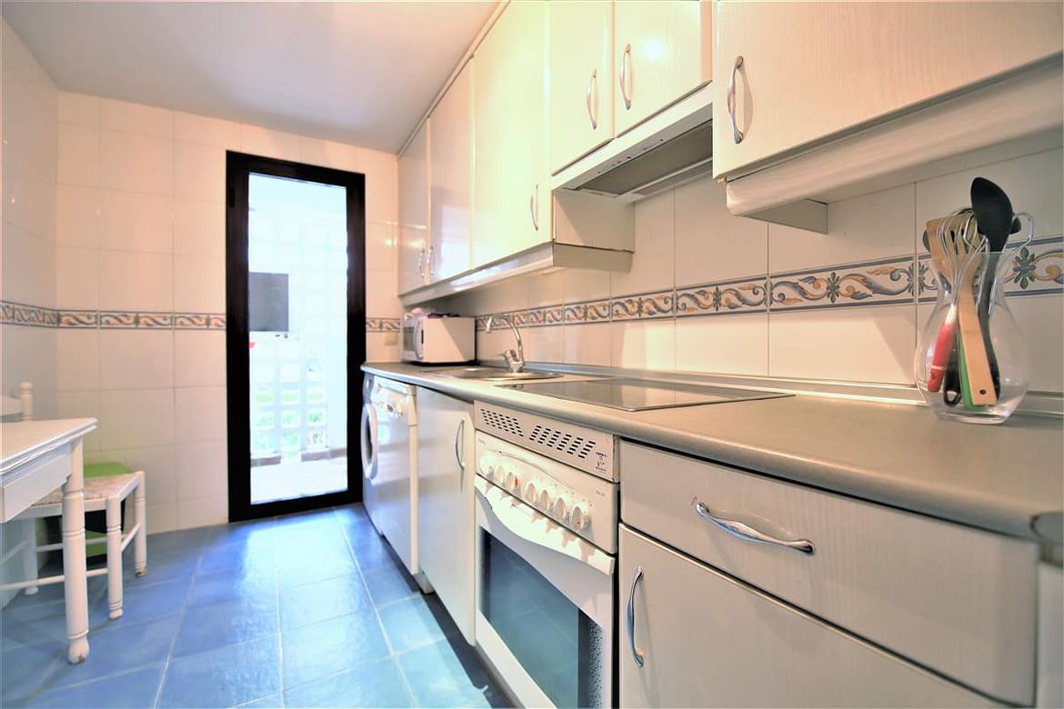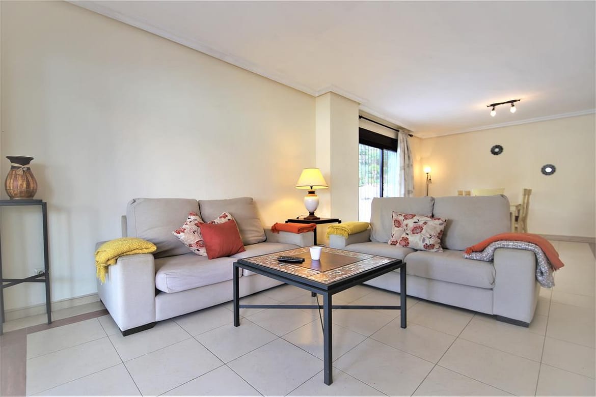 This lovely two bedroom ground floor apartment has been furnished and decorated with comfort and simplicity in mind to provide the ideal holiday accommodation where you just arrive with your suitcase and settle in. The accommodation includes a spacious and comfortable lounge/dining room with a flatscreen TV, a high speed Wifi connection along with an international TV package including Sky. A super king size bedroom with en-suite bathroom, a twin bedroom, family bathroom, and an independent fully fitted kitchen. From the lounge you walk onto the large terrace area which is ideal for escaping the afternoon sun or al fresco dining in the evenings. The kitchen is well equipped and the development has a large community swimming pool with a separate children’s pool. The apartment is fully air conditioned and includes a designated underground parking space which is particularly useful in the height of summer. The complex has two access points on either side and there is a long ramp for a wheelchair (but quite steep) for access from the supermarket side of the complex. There are many plants throughout the urbanisation making it a pleasant walkway. This property is walking distance from the famous Puerto Banus and there are many bars and restaurants within walking distance.