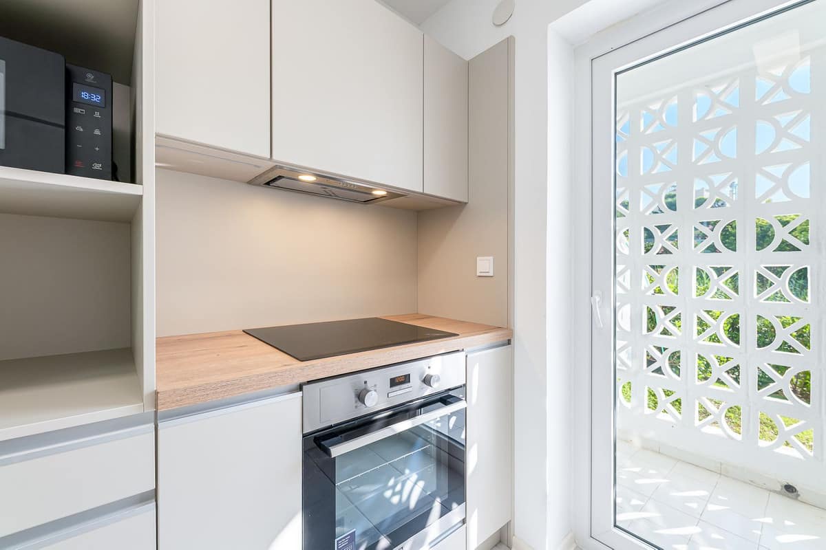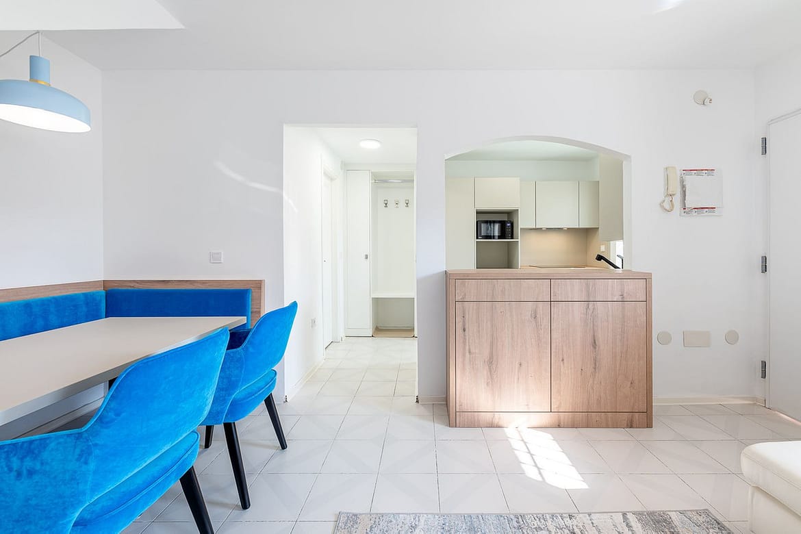 The property includes a private underground parking space and access to a community pool, ideal for relaxing and enjoying the Mediterranean climate.