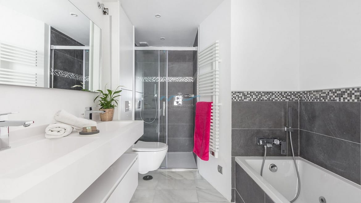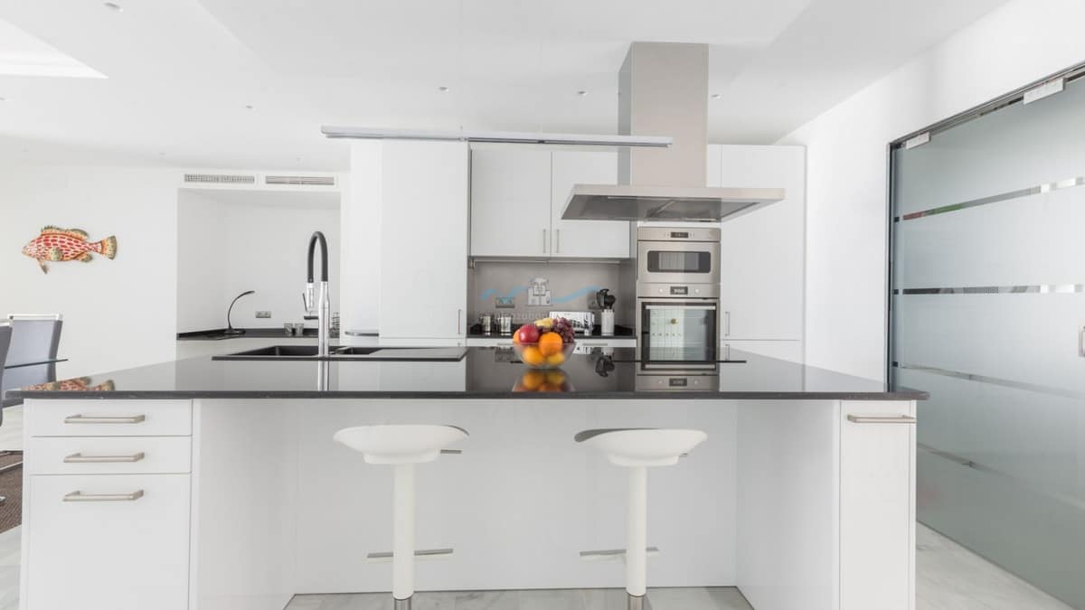 The apartment comprises of a hallway, a large lounge/dining area, one master bedroom with en-suite bathroom, one double bedroom with 2 single beds and separate bathroom, open kitchen with dishwasher with separate utility room with washing machine and dryer with marble floors throughout and full (hot and cold)A/C.