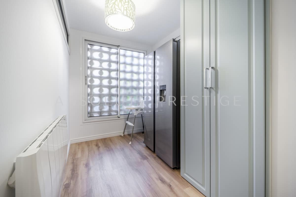 The kitchen is designed for functionality, while the open-plan living and dining areas create a seamless flow throughout the apartment. Additional features include a private parking space in the underground garage and a storage room for added convenience.