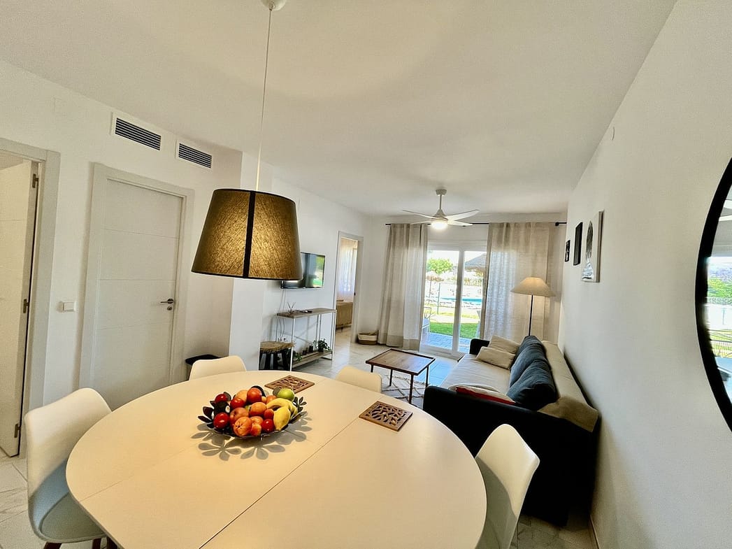 The beautifully decorated living room with dining area is separated from the kitchen and opens up to the terrace. It is equipped in a dining table and lets you relax in the garden, which overlooks the entire complex and the two pools, one of which is a children's pool. The pool is surrounded by a beautiful garden with palm trees, sun lounges and parasols, offering some shadow for hot summer days.