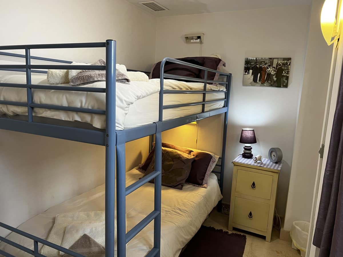 Master bedroom with double bed and ensuite bathroom with shower over. Bunk bed room with large walk in shower room.