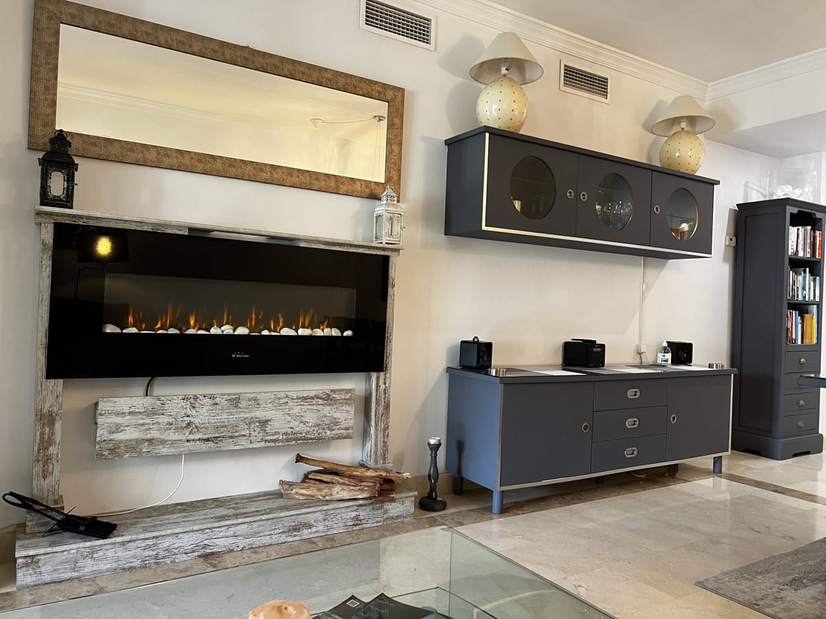 Gated secure development with a lift up from the underground parking space to the ground floor where this apartment is located. The living room is open plan with an electric feature fireplace, dining table for 6, sofa with built in stalls and doors leading out to a covered terrace with glass curtains which lead to a garden laid with grass. There is a gate that leads to the communal gardens where you will find a large pool and a childrens pool.