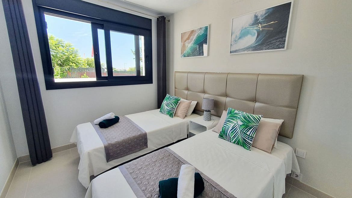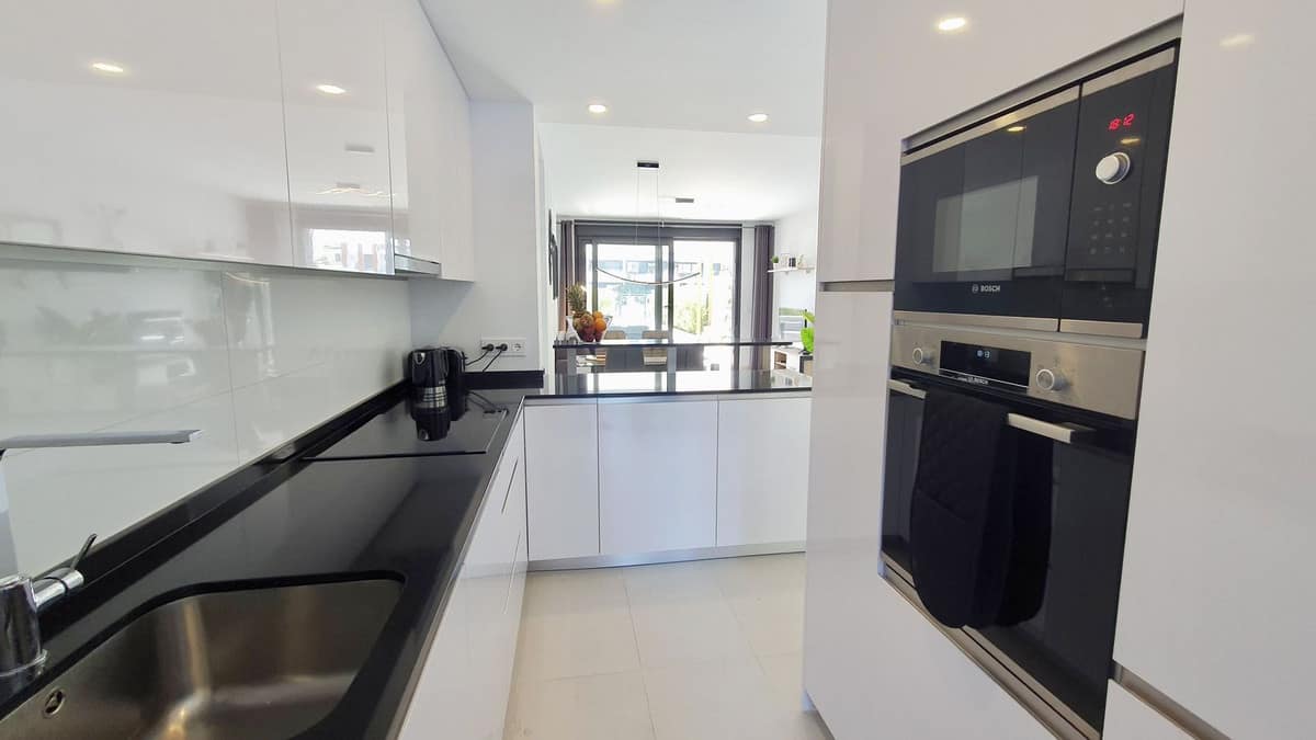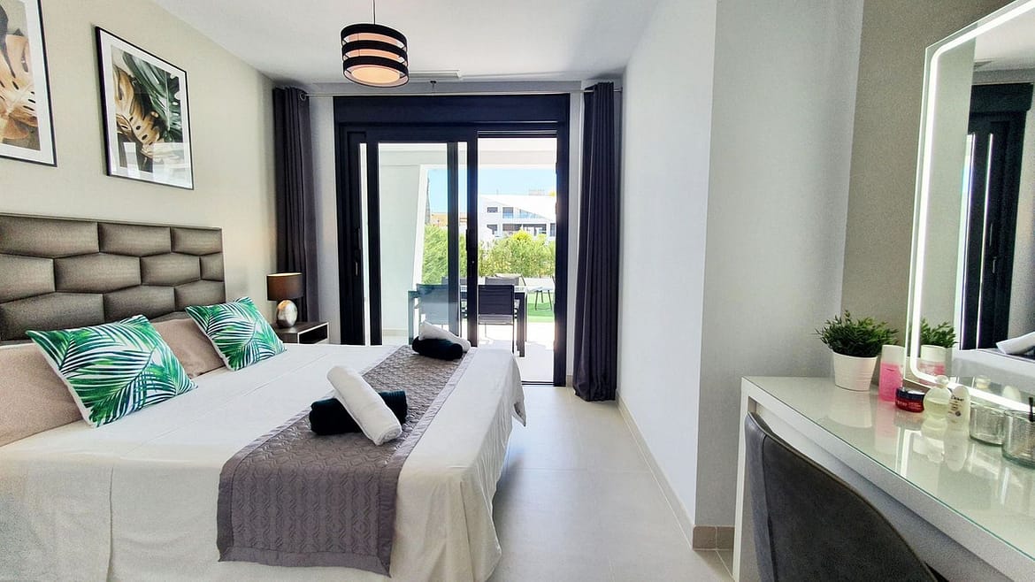 The garden connects directly to the tranquil communal areas featuring beautifully landscaped Mediterranean gardens, swimming pools, jacuzzis, and a children’s play area.