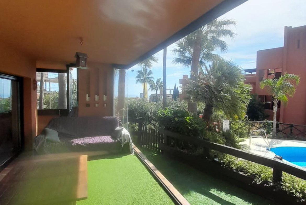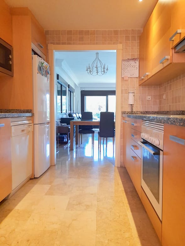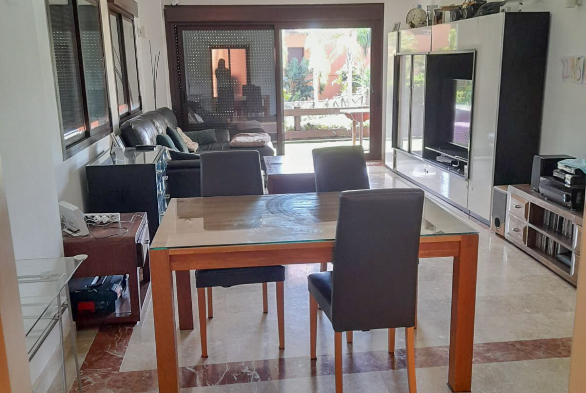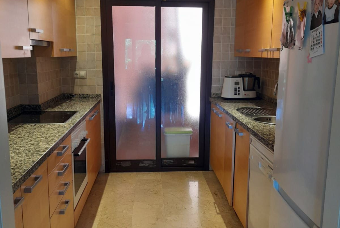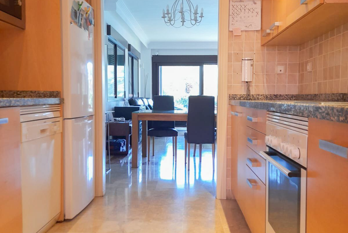 We present this spacious and very bright ground floor apartment. Upon entering, we find an entrance hall that leads to a separate kitchen with a laundry room and to a very open living-dining room thanks to a large window that connects to the generous terrace, with partial sea views, from which there is direct access to the communal pool. The living room also has two additional windows on the side, providing natural light throughout the day.