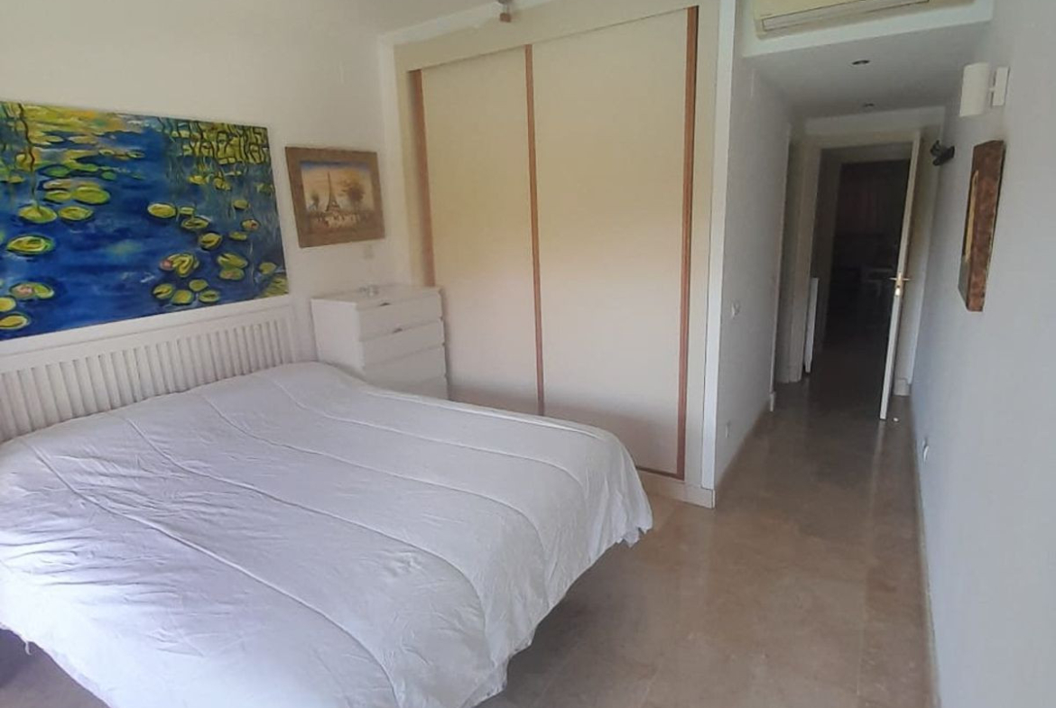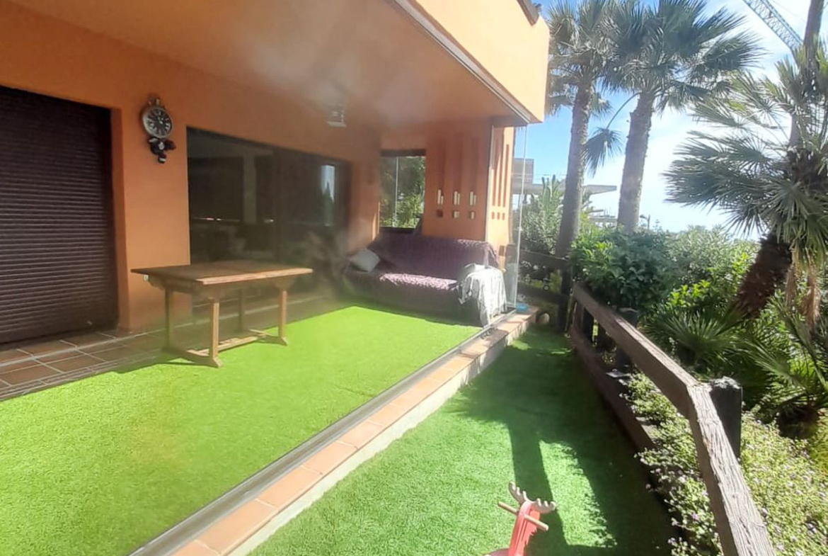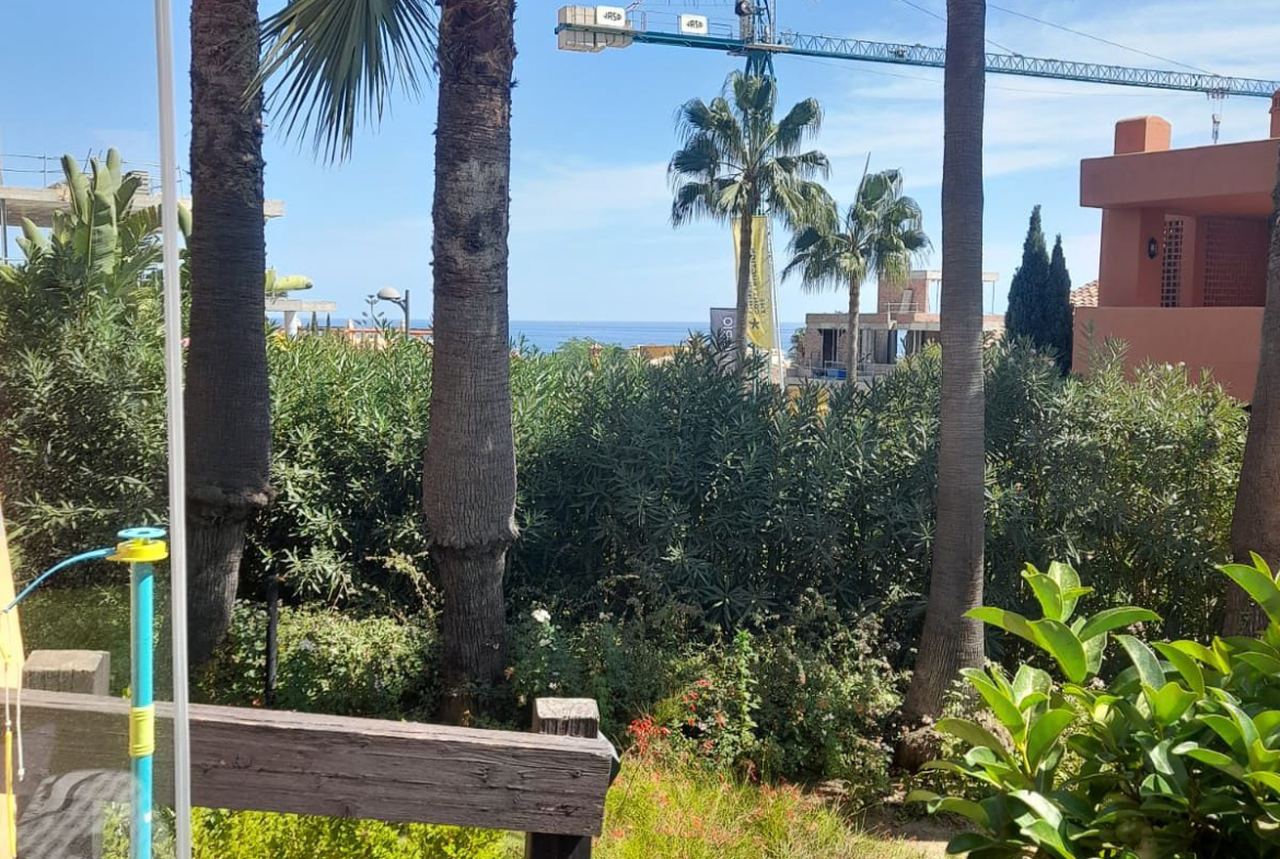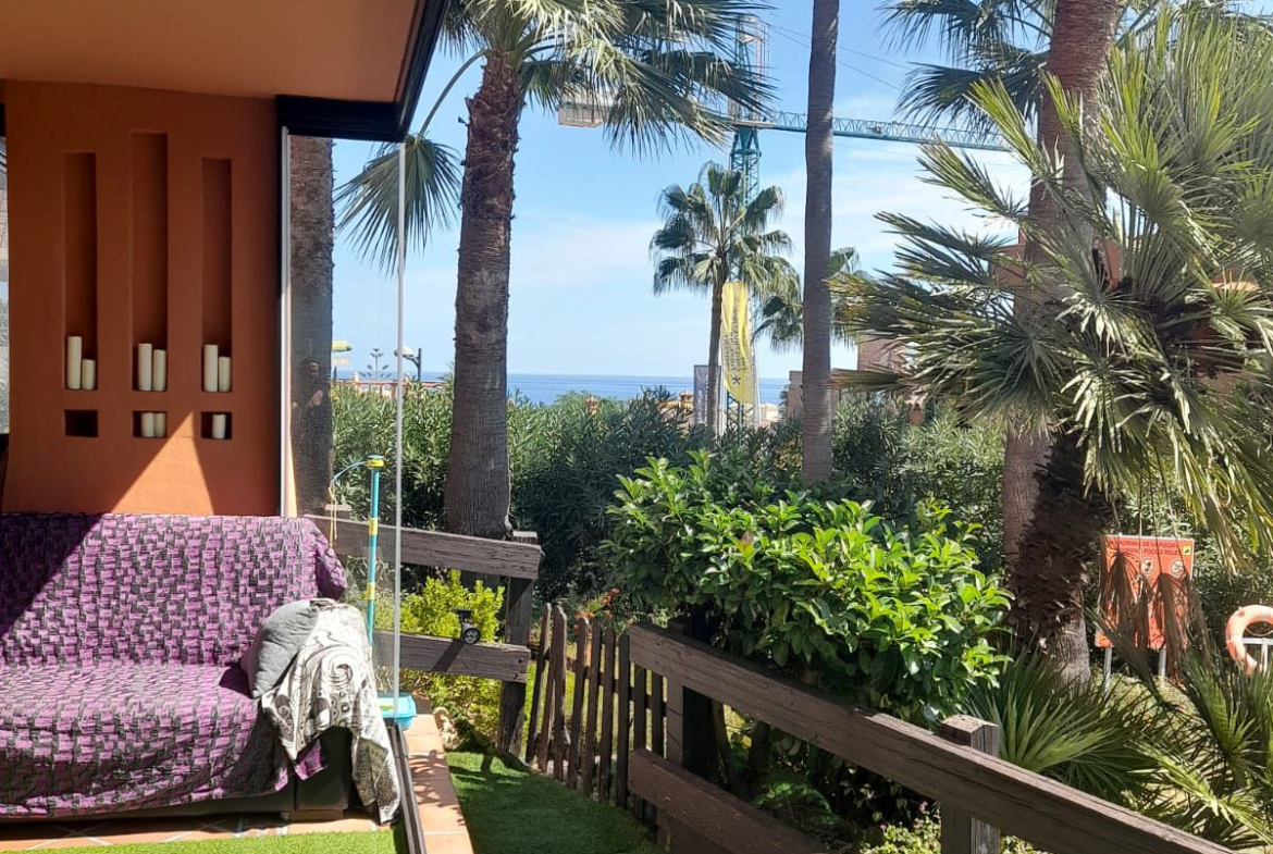 We present this spacious and very bright ground floor apartment. Upon entering, we find an entrance hall that leads to a separate kitchen with a laundry room and to a very open living-dining room thanks to a large window that connects to the generous terrace, with partial sea views, from which there is direct access to the communal pool. The living room also has two additional windows on the side, providing natural light throughout the day.