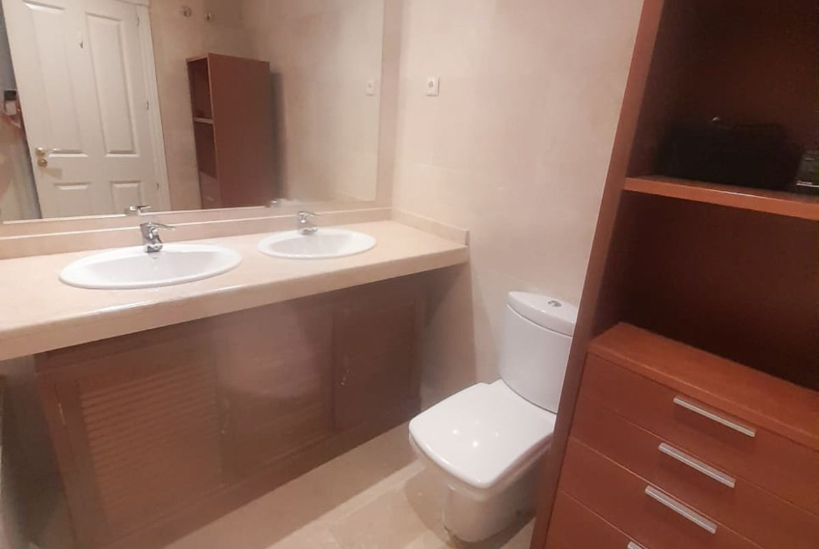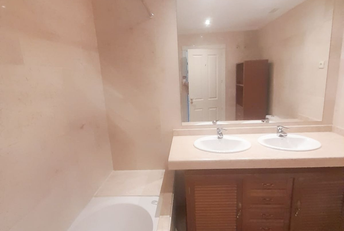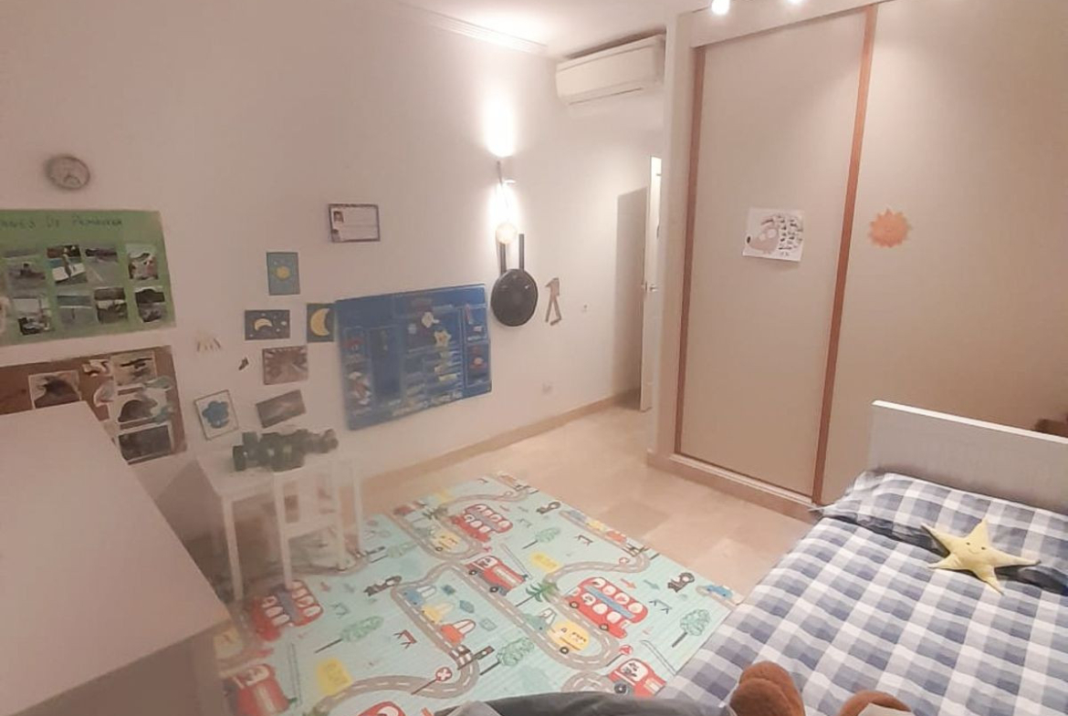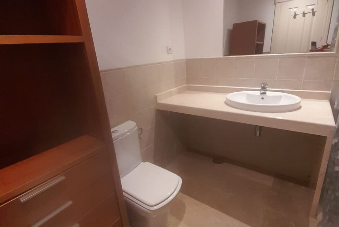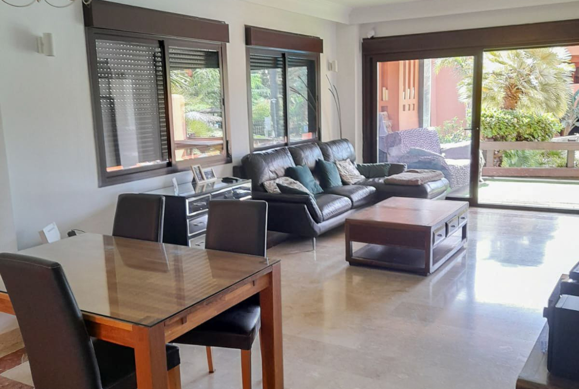 We present this spacious and very bright ground floor apartment. Upon entering, we find an entrance hall that leads to a separate kitchen with a laundry room and to a very open living-dining room thanks to a large window that connects to the generous terrace, with partial sea views, from which there is direct access to the communal pool. The living room also has two additional windows on the side, providing natural light throughout the day.