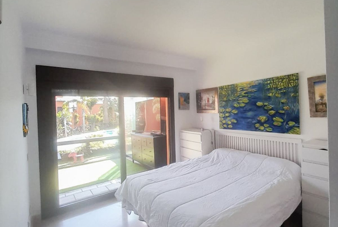 The property has two double bedrooms: the master bedroom with en-suite bathroom, fitted wardrobe, and access to the terrace overlooking the pool; the second bedroom also has a fitted wardrobe. The exterior carpentry is aluminum, and the doors are lacquered in white.