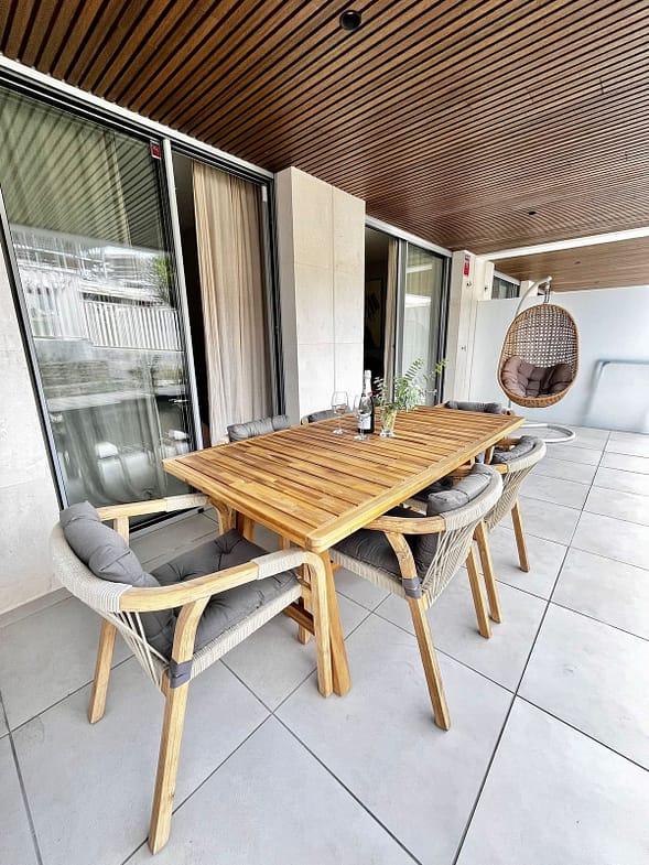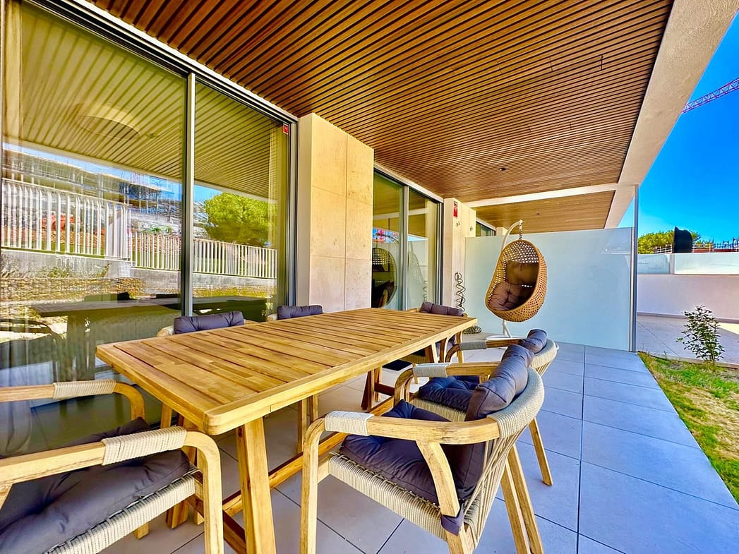 The apartment is equipped with a living room with access to the terrace and garden with a dining room and an open fully equipped kitchen and utility room, where there is a washing machine and dryer.