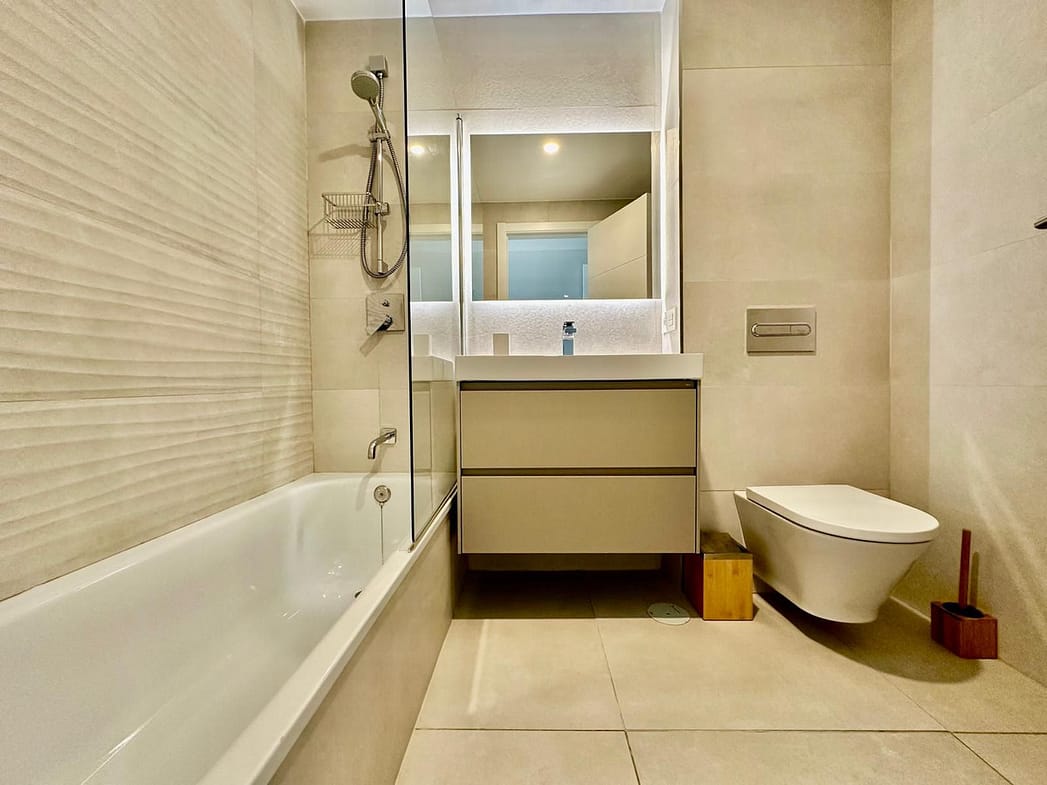 The master bedroom has a private bathroom with a bathtub and access to the terrace.