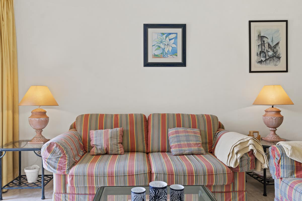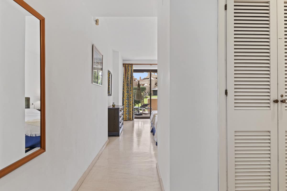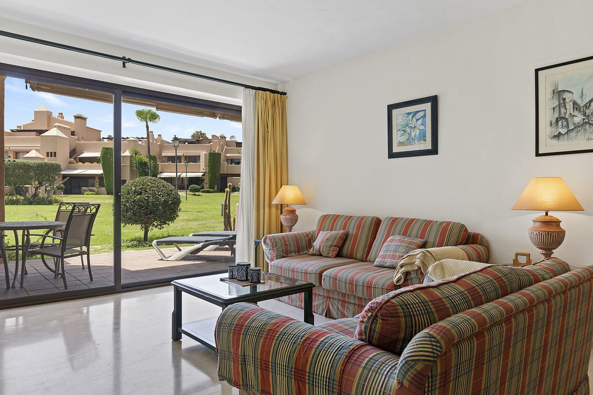 Inside, the apartment is bright and inviting, with air conditioning throughout for year-round comfort. The spacious living area provides direct access to the terrace, garden, and pool area, enhancing the sense of indoor-outdoor living. An exterior awning offers shade on sunnier days, extending the use of the terrace.