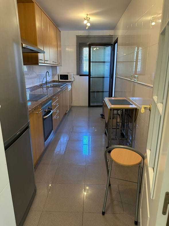 Inside, the apartment features a welcoming hallway, a spacious living room with a cozy fireplace, and a fully equipped kitchen with an adjoining laundry room. The master bedroom includes a complete en-suite bathroom with a bathtub, walk-in shower, and double sinks, as well as ample closet space and direct terrace access. A comfortable guest bedroom and a guest bathroom complete the layout.