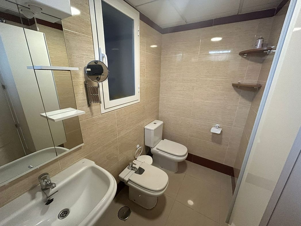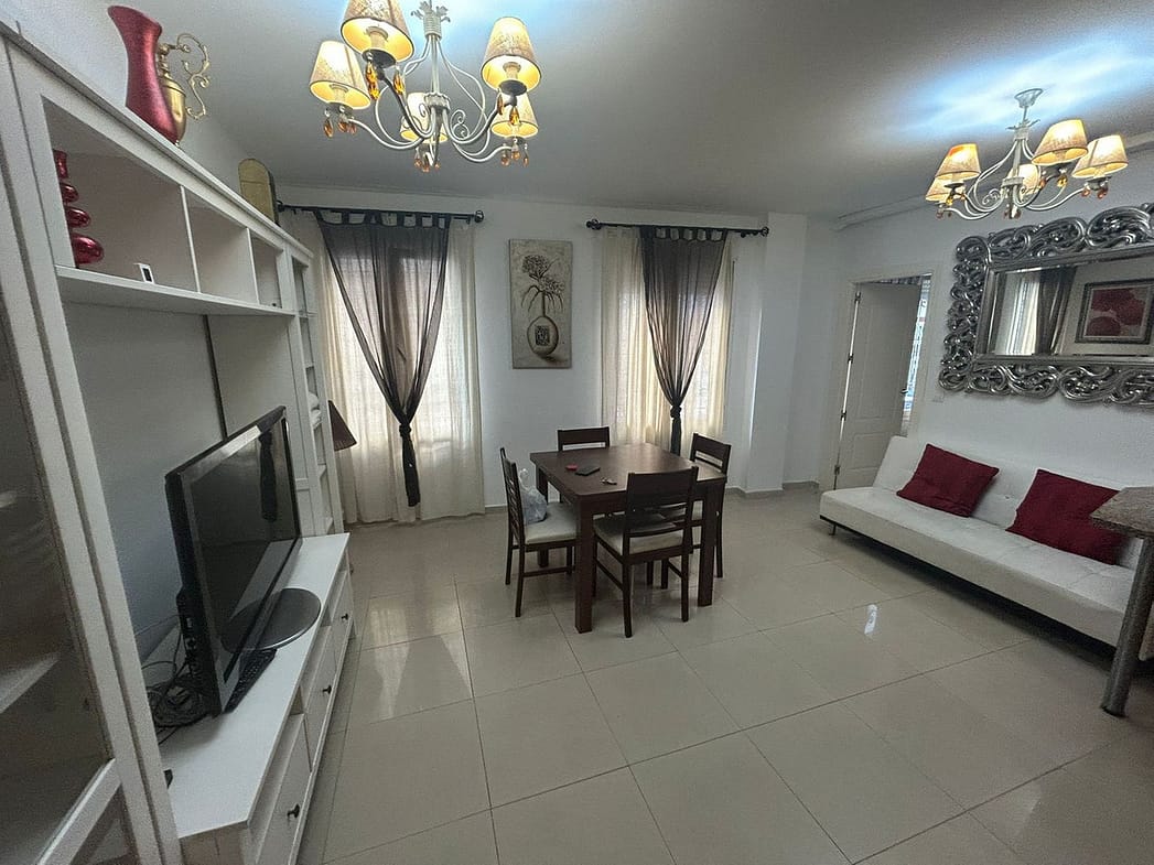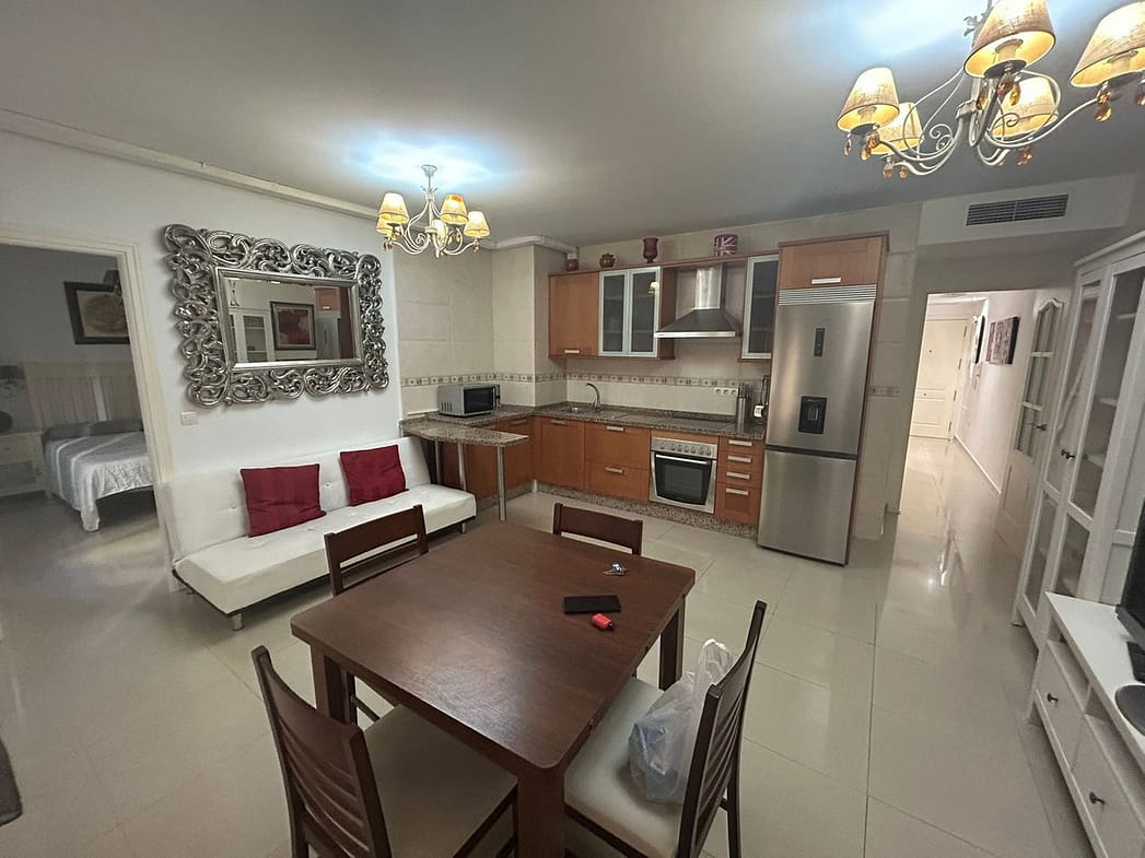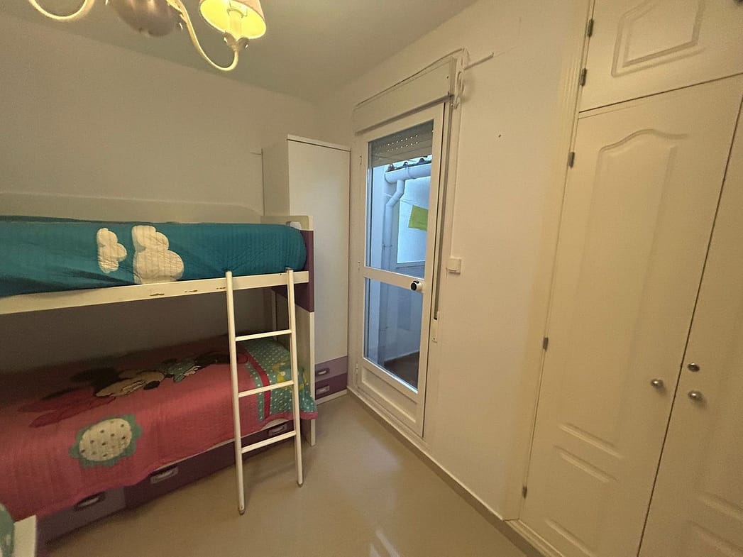 Ground floor apartment for sale, 66 m², in Fuengirola, Málaga. This apartment is just 100 meters from El Galgo beach (port area) and 100 meters from the heart of Fuengirola (Plaza La Constitución). It enjoys a prime location surrounded by shops, restaurants, and all kinds of amenities. The bus station is 150 meters away and the train station just 200 meters away. The apartment has air conditioning throughout. It features a full bathroom with shower and a window overlooking the patio, a spacious living room with two windows, an open-plan kitchen with appliances and all furnishings, a master bedroom with air conditioning and a window, and a second bedroom with two bunk beds plus a trundle bed, comfortably sleeping 5 people. It also includes wardrobes and a built-in wardrobe. There is a semi-covered patio with a laundry area. The price includes a private parking space and a storage room in the same building.