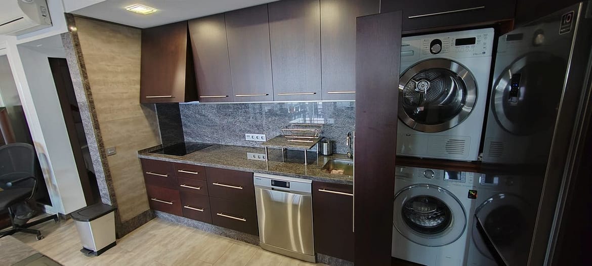 The property offers approximately 60 m², distributed into 2 bedrooms with fitted wardrobes, 2 full bathrooms with walk-in showers, and a fully equipped open-plan kitchen with breakfast bar, integrated into a bright and welcoming living-dining area.