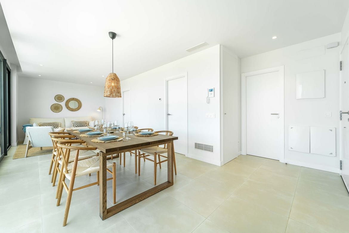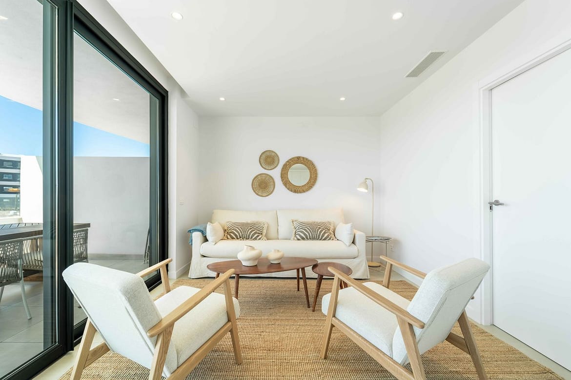 The apartment features two spacious bedrooms and two bathrooms, including a master suite with ensuite layout.. Indoors, comfort is ensured with underfloor heating in the bathrooms, aerothermal climate control, and a modern fitted kitchen. Outdoors, the elevated terrace becomes an extension of the living space — perfect for relaxed mornings, alfresco dining, or evening gatherings.