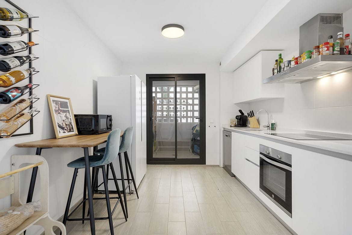 Upon entering, on the left side, there is a spacious, semi-open kitchen equipped with all necessary built-in appliances. Next to the kitchen, there is a separate, enclosed room where the washing machine and dryer are also located.