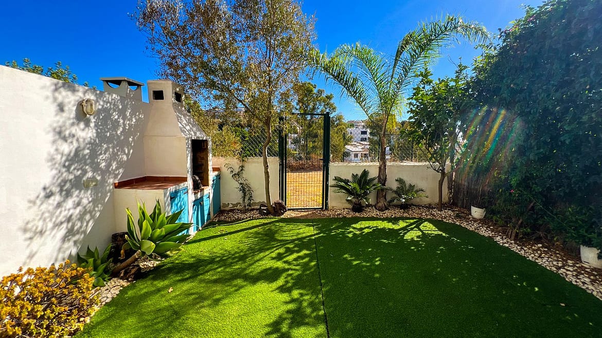 Large outdoor area with artificial grass and barbecue, perfect for family gatherings and entertaining
