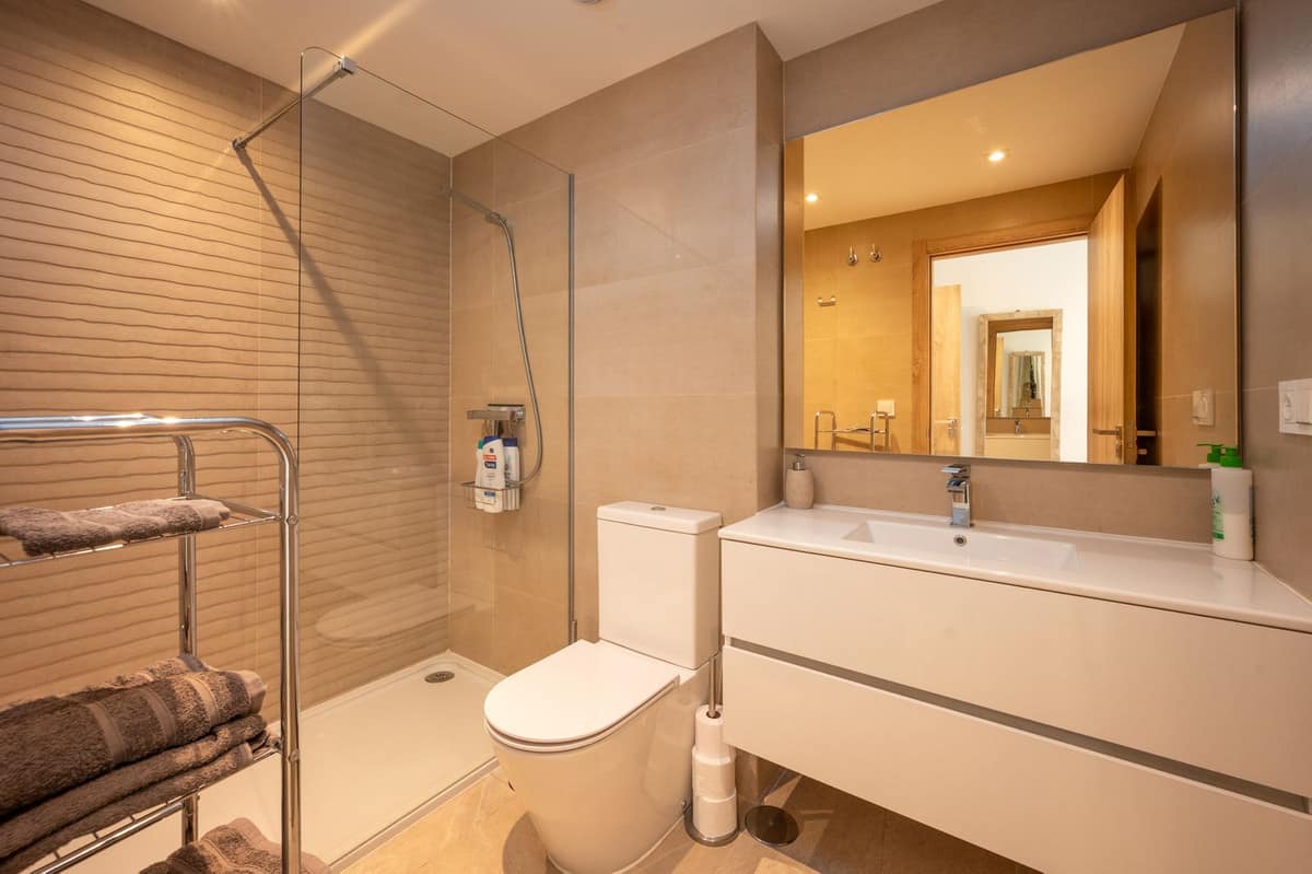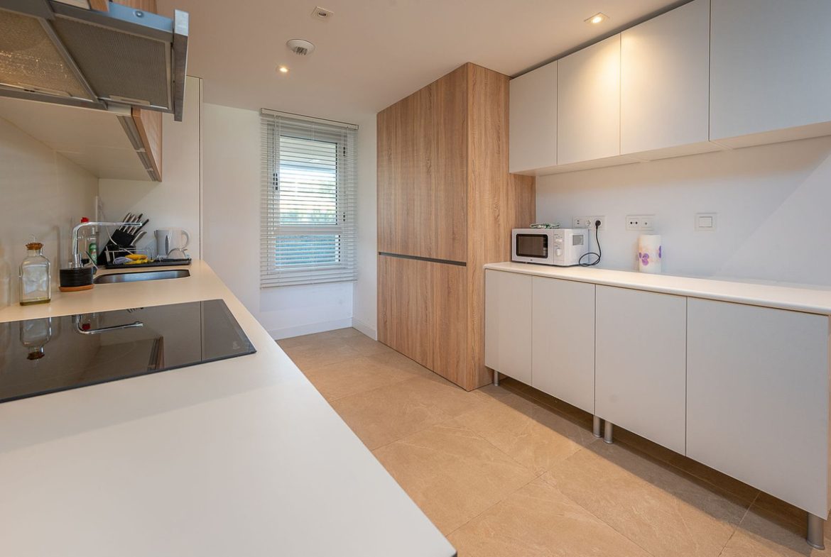Inside, the home boasts an open-plan living and dining area with a fully equipped kitchen, creating a modern and welcoming space for everyday living. It offers two double bedrooms with built-in wardrobes and two full bathrooms, one of them en-suite.