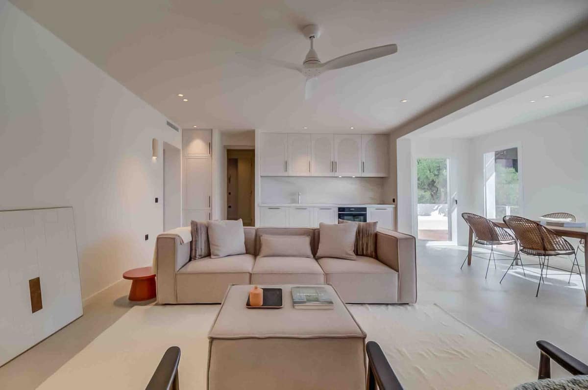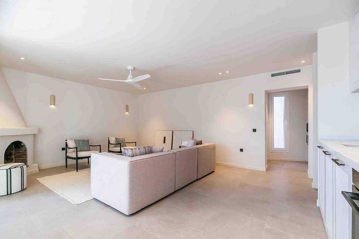 The spacious open-plan living room and kitchen immediately set the tone: bright, airy and designed for effortless everyday life. Large windows draw the sunlight inside and connect the home directly with the southwest-facing terrace – an outdoor extension of the living room where you can enjoy warm afternoons, golden sunsets and the gentle Mediterranean breeze all year round.